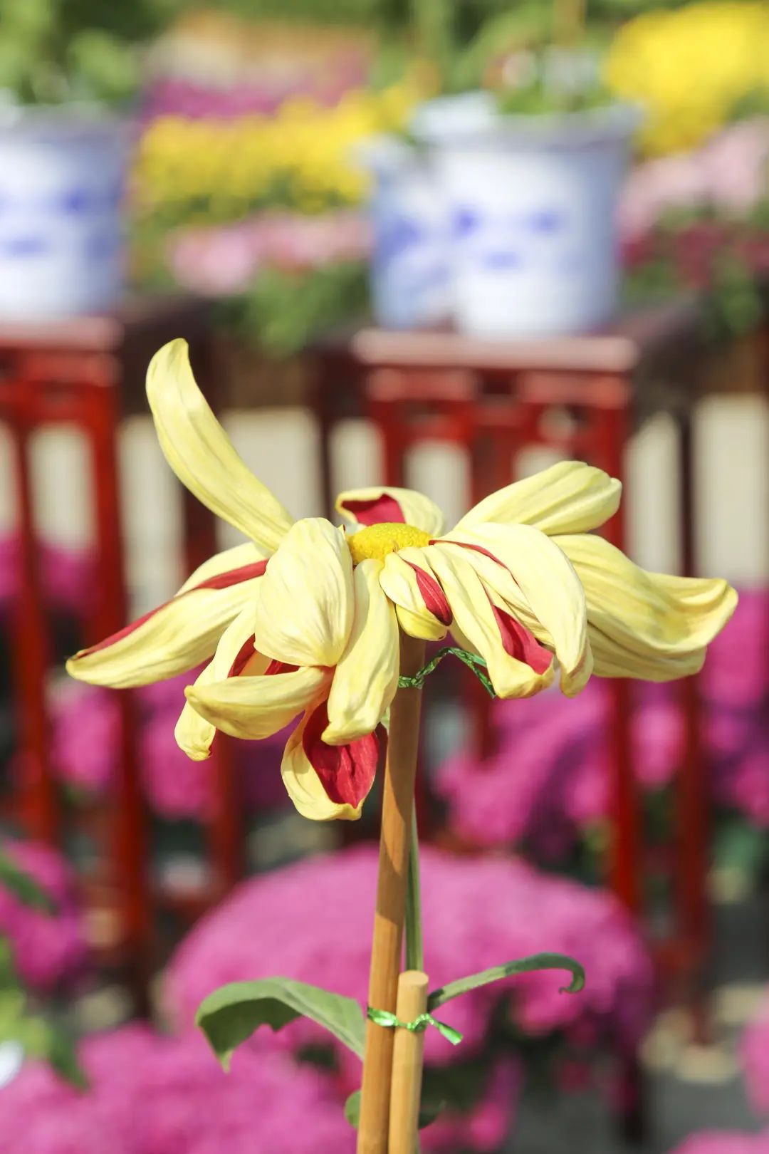 武汉钢铁有限公司、中国一冶集团、中冶集团武汉勘查研究院、中韩(武汉)石油化工有限公司、武汉船用机械有限责任公司、区教育局等单位打造的菊艺小品环绕在主景四周,通过多种菊花品种的精心搭配,营造出浓郁的菊韵文化。