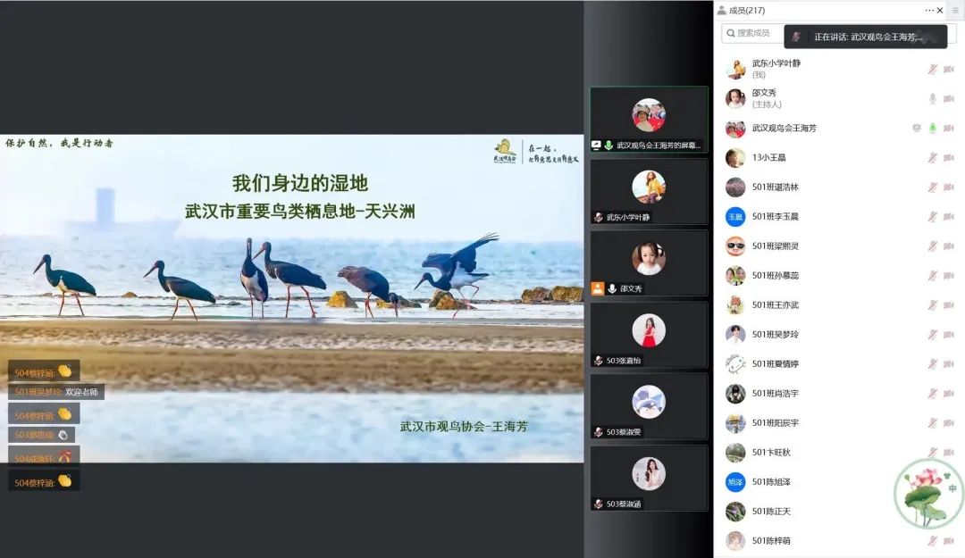 活动中,武汉市观鸟协会秘书长王海芳与同学们分享了宣传片《天兴洲湿地观鸟》,并讲述了观鸟协会成员在天兴洲湿地开展观测和保护鸟类的小故事。他介绍,武汉市是百湖之市、湿地之城,目前观测到的鸟类有447种,天兴洲湿地能观测到的鸟类就有236种。
