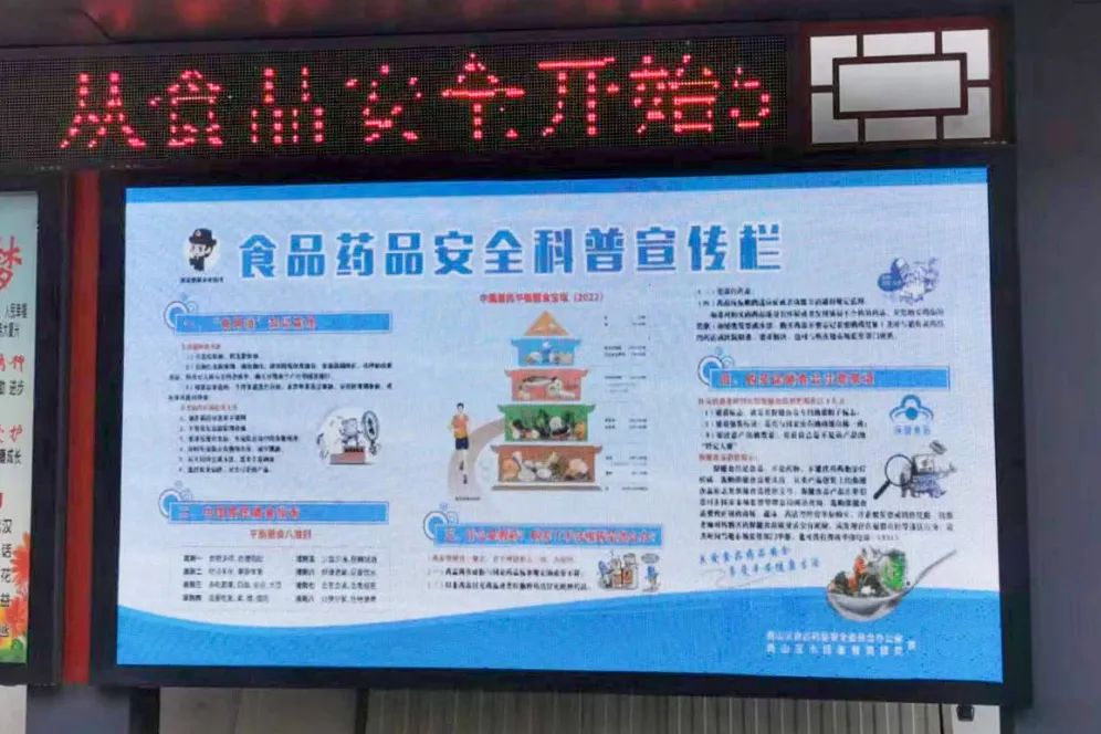 青山区食安办每季度策划、编辑、设计食品安全宣传主题推送到社区、学校及各成员单位,通过张贴海报、播放LED宣传口号、视频、广播、设置展览等形式广泛开展食品安全宣传,做到学校、社区全覆盖,进一步扩大和提升群众对食品安全的知晓率和满意率。