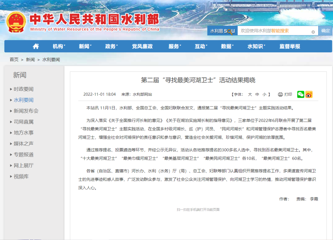 第二届“寻找最美河湖卫士”主题实践活动结果通报 图片截自:水利部网站