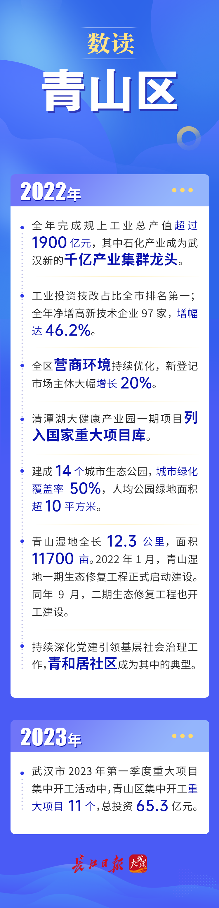 近年来,青山区着力推进产业转型升级,加速新旧动能转换。2022年,青山区工业投资技改占比全市排名第一;全年净增高新技术企业97家,增幅达46.2%,企业培育工作考核并列全市第一;全区营商环境持续优化,新登记市场主体大幅增长20%。曾经的老工业区,不断迸发出新的发展活力。