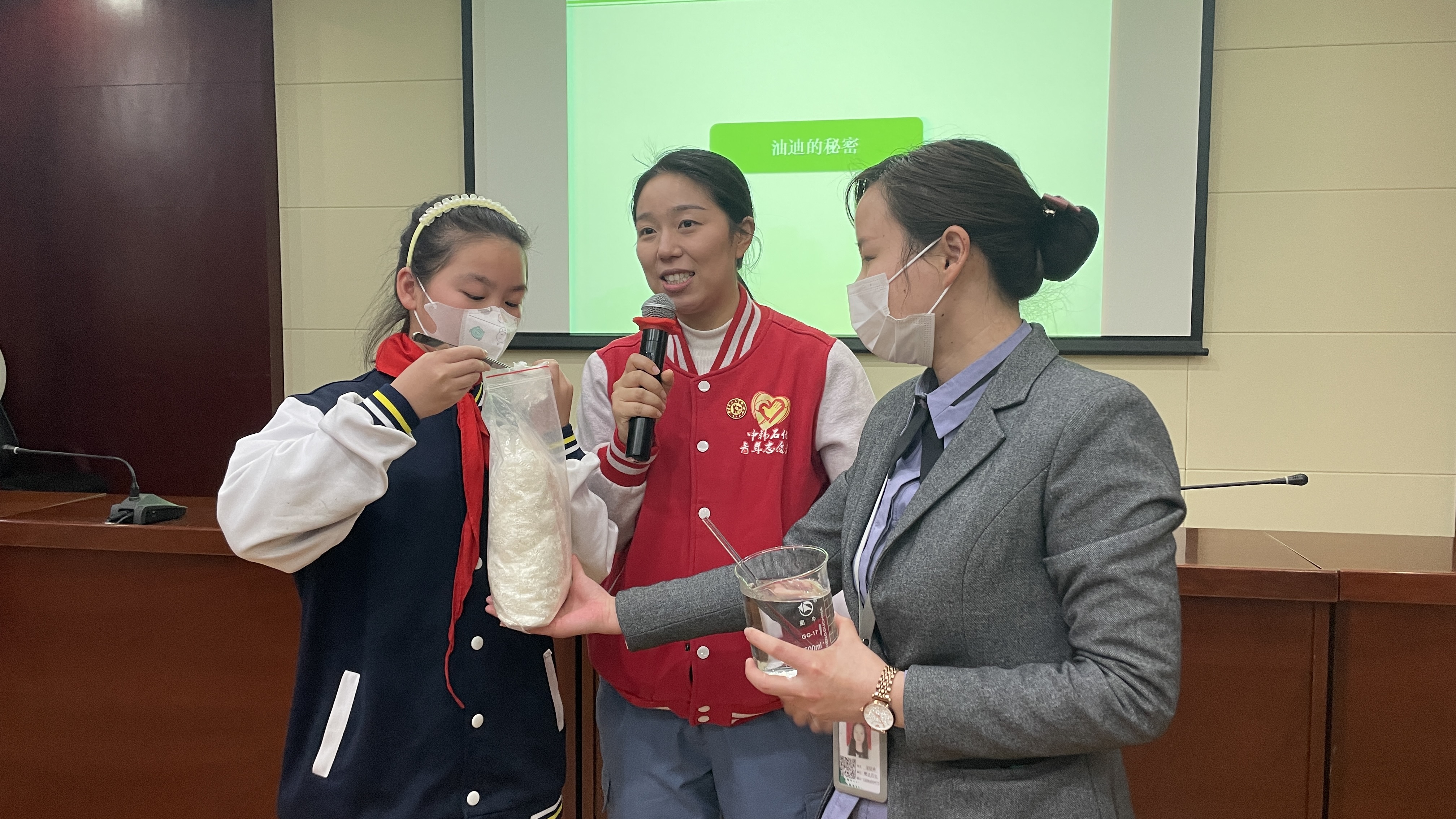 少先队员们还进入了厂区智慧课堂,学习有关石油知识,接触石化科学,了解石化工业。课堂上,志愿者让小队员用镊子夹起几根看似普通的布条放入水中,搅拌几下后,竟然在水中消失不见了,引起队员们的阵阵惊呼。原来这就是神奇的水溶性纤维。志愿者介绍道,水溶性刺绣、水溶蕾丝已成为大热面料,在服装上应用了水溶性面料,当适宜温度的水充分接触服装后,面料便会自动溶解,变成一件全新的服装。志愿者还向队员们介绍了石油在生活中的运用,让队员们明白了石油和人类的衣食住行息息相关,必须要合理利用能源、节约能源。