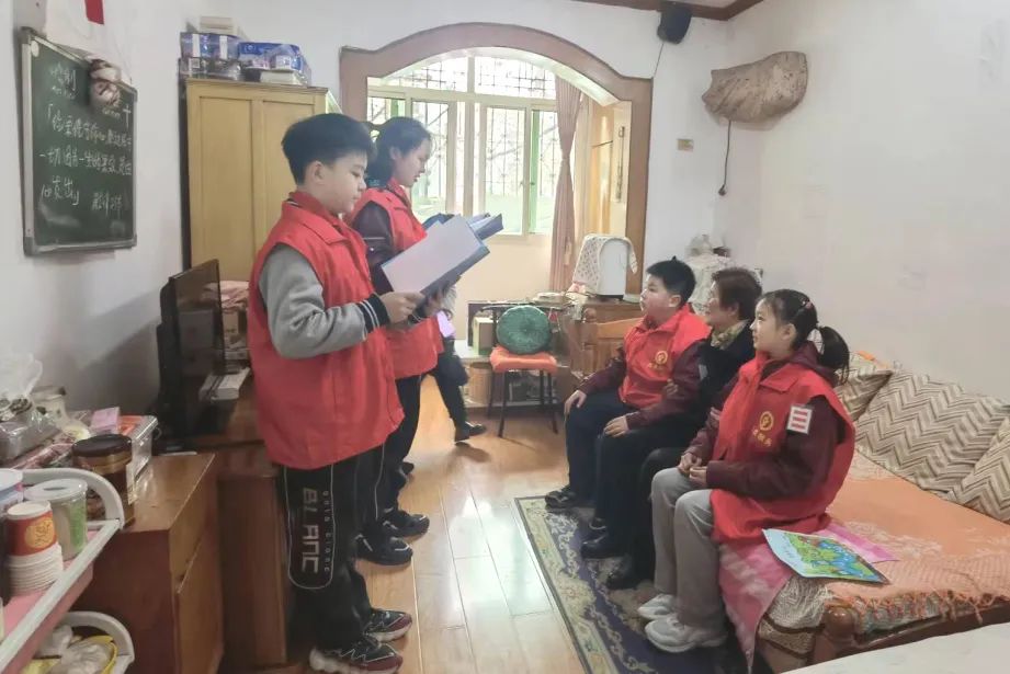 最后小志愿者们来到独居老人邬晓珊家里,声情并茂地朗诵《走向人民纪念碑》,为她送上党的二十大精神和垃圾分类手绘画。邬晓珊老人非常感动,赞叹他们小小少年大有可为,寄语他们一定要好好学习,以后做一名社会的栋梁之才。