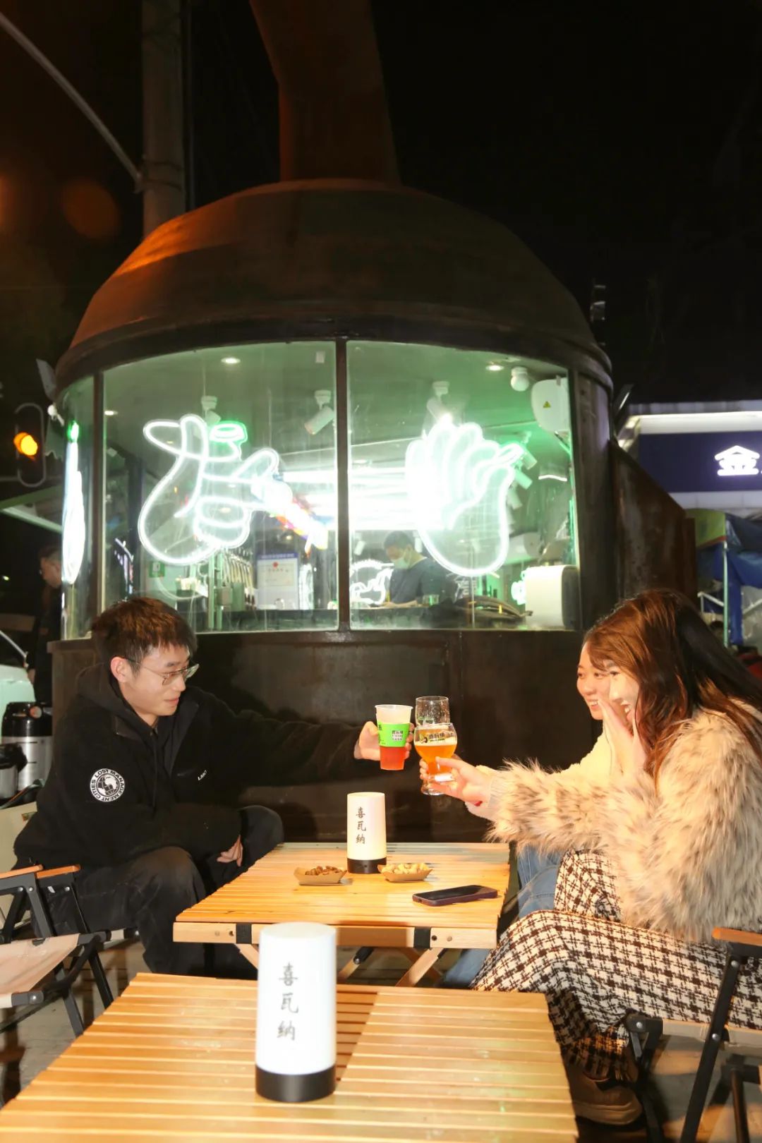 除了高冷,喜瓦纳也有着温暖柔和的一面!为了能让顾客在夜色中慢下来,喜瓦纳还在一墙之外摆上了小桌和小马扎,打造了一方温馨的小天地。三五好友不论是举杯还是闲谈,一定能将这个夜晚过得有声有色。可以想象的是,盛夏时节,这里将人声鼎沸吧!