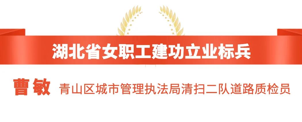 曹敏是青山区城管执法局清扫二队的普通一员,她从一名普通的环卫工人逐步成长为独当一面的质检员,工作认真勤勉,任劳任怨不计得失。疫情期间主动请缨方舱医院舱内隔离区的清扫任务,被方舱医院指挥部临时党委评为先进个人。转任道路质检员后,她努力学习各项工作理论,摸索出高效、快速的人员车辆配置方案,大大提高了工作效率,2020年被武汉市总工会授予“武汉市五一劳动奖章”称号。