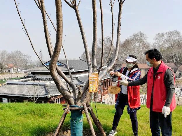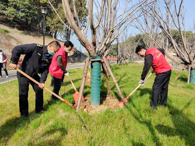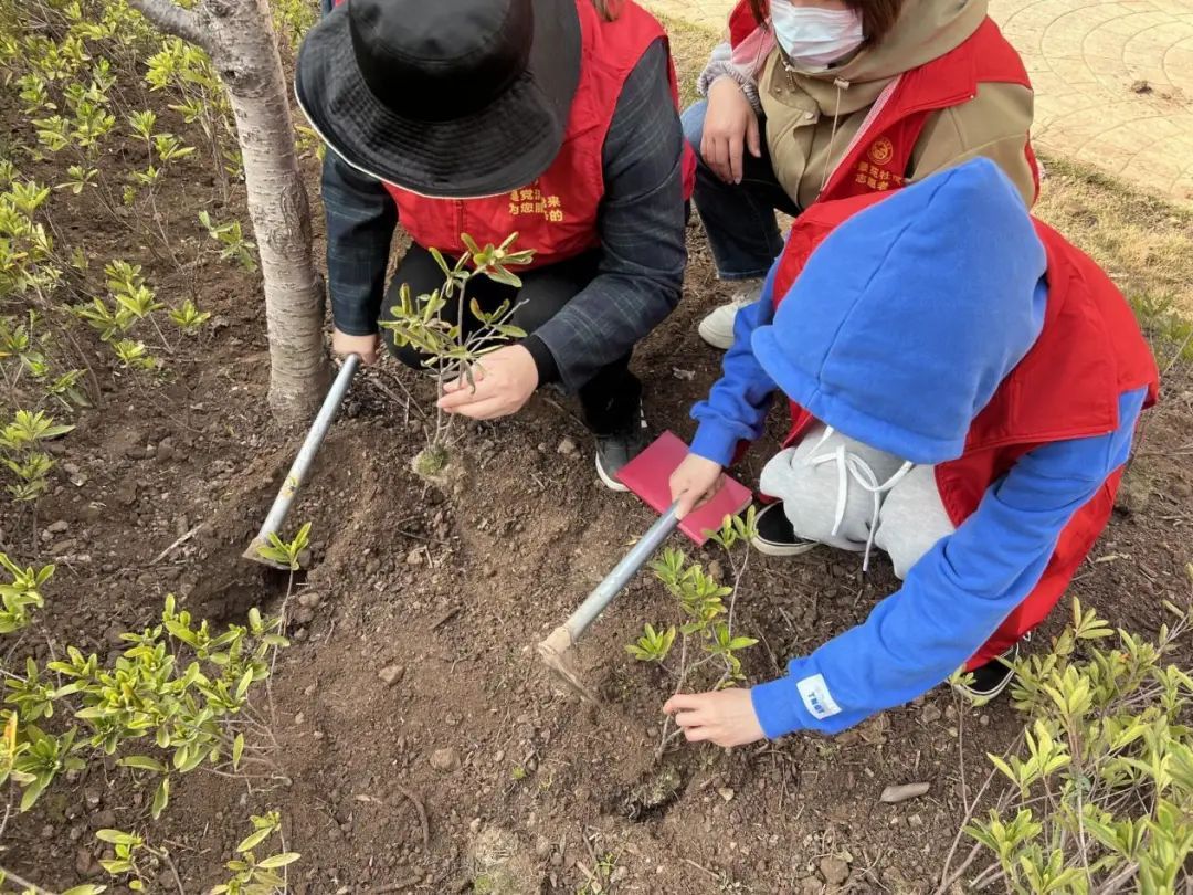 春和景明,新绿初绽。志愿者们穿上统一的红马甲,戴上手套,拿着铁锹兴致勃勃地奔赴青山矶公园。在公园工作人员的指导下,大家两三人一组,分工协作。