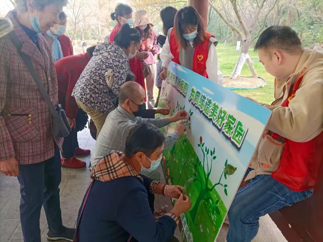 居民们漫步在青山公园里,欣赏着满园盛开的樱花、梅花,享受着满园的春意盎然。志愿者向居民发起爱绿护绿倡议,大家纷纷响应,要做爱绿护绿的好市民。