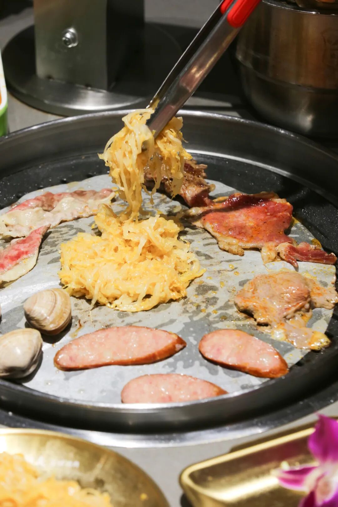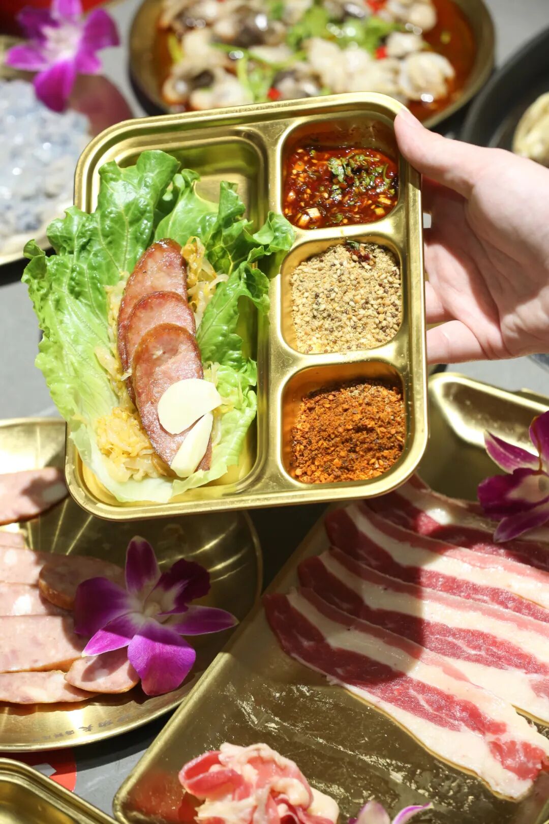 除此之外,还有各种秘制五花肉、秘制牛肉、哈尔滨红肠等都值得一试,特别是东北酸菜,烤热乎后搭配烤肉生菜生蒜,解腻增香一绝,各种刺激让多巴胺疯狂分泌,不仅上瘾,而且上头。