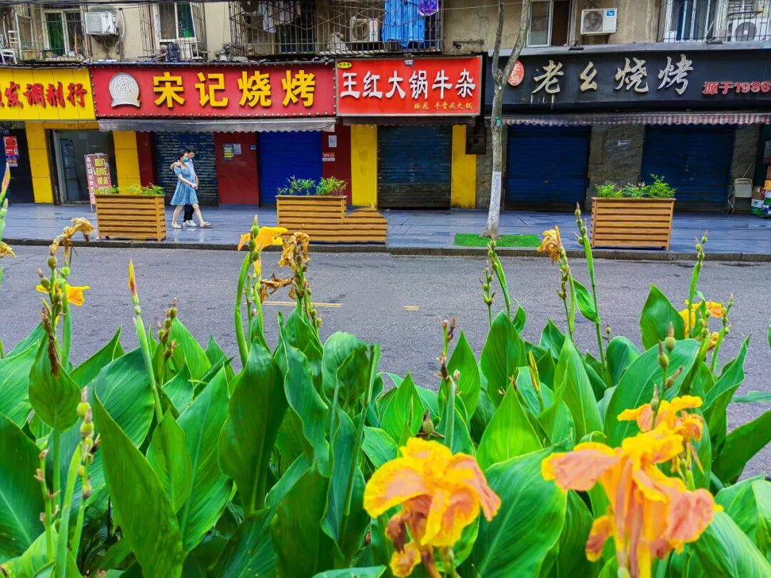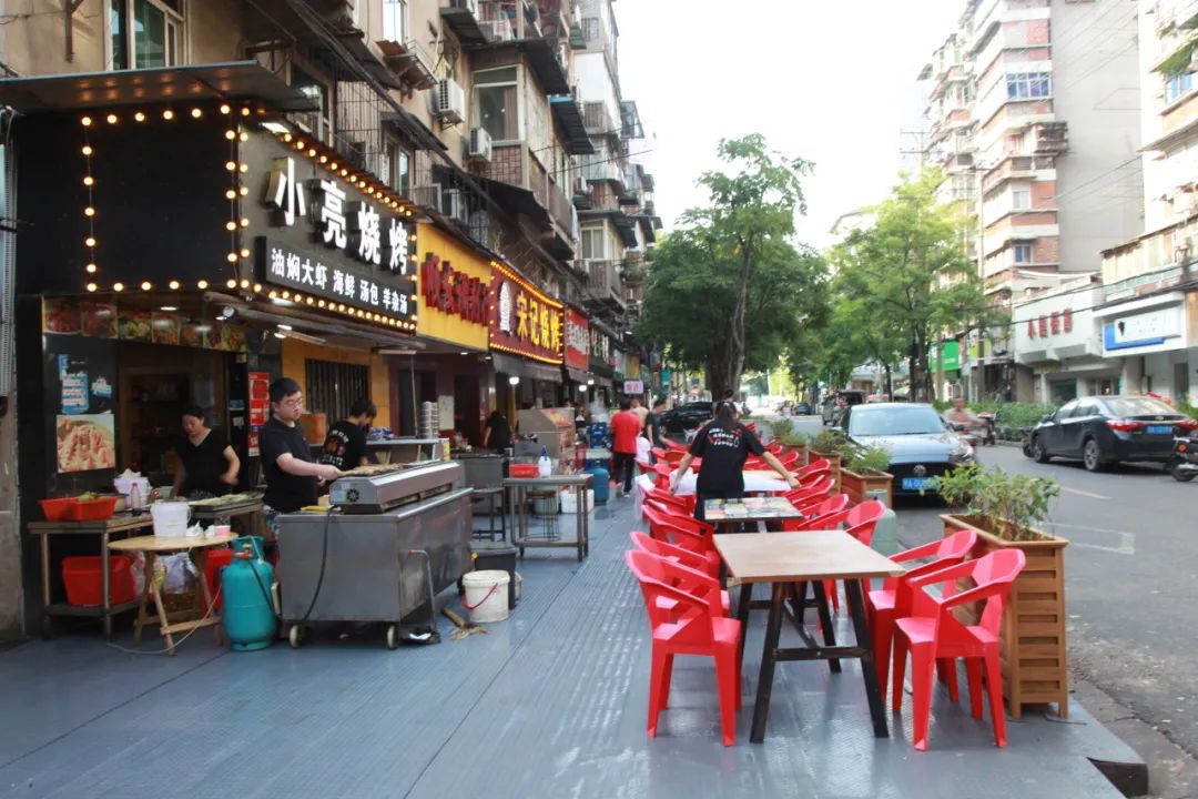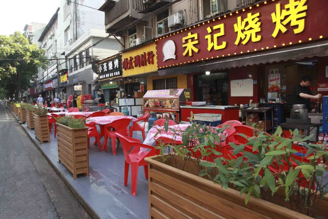 在工业三路烧烤夜市,每家店面门前都铺设着整块的灰色地垫;24个轻巧的栅格不锈钢木纹花厢有序立放在人字沟边缘,花厢内的南天竹和金丝桃树苗含苞待放;花箱与店铺之间的人行道上,摆放着统一样式的红色餐桌,食客来来往往。老幺烧烤店店主说,“自从夜市整治后,面貌焕然一新,食客们都很满意,生意也红火了起来。”