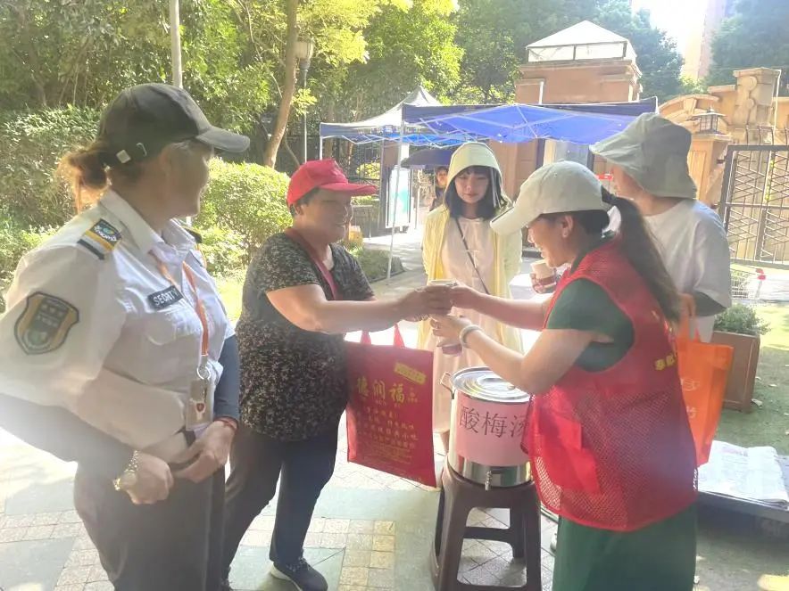 “社区制作的冰镇酸梅汤,清凉解暑快来尝尝。”志愿者推着小推车走街串巷为辖区居民和保安送清凉,向居民们普及防暑降温小知识。居民王爹爹接过冰凉的酸梅汤开心地表示:“社区同志们太贴心了,顶着大太阳给我们送来一片清凉。”