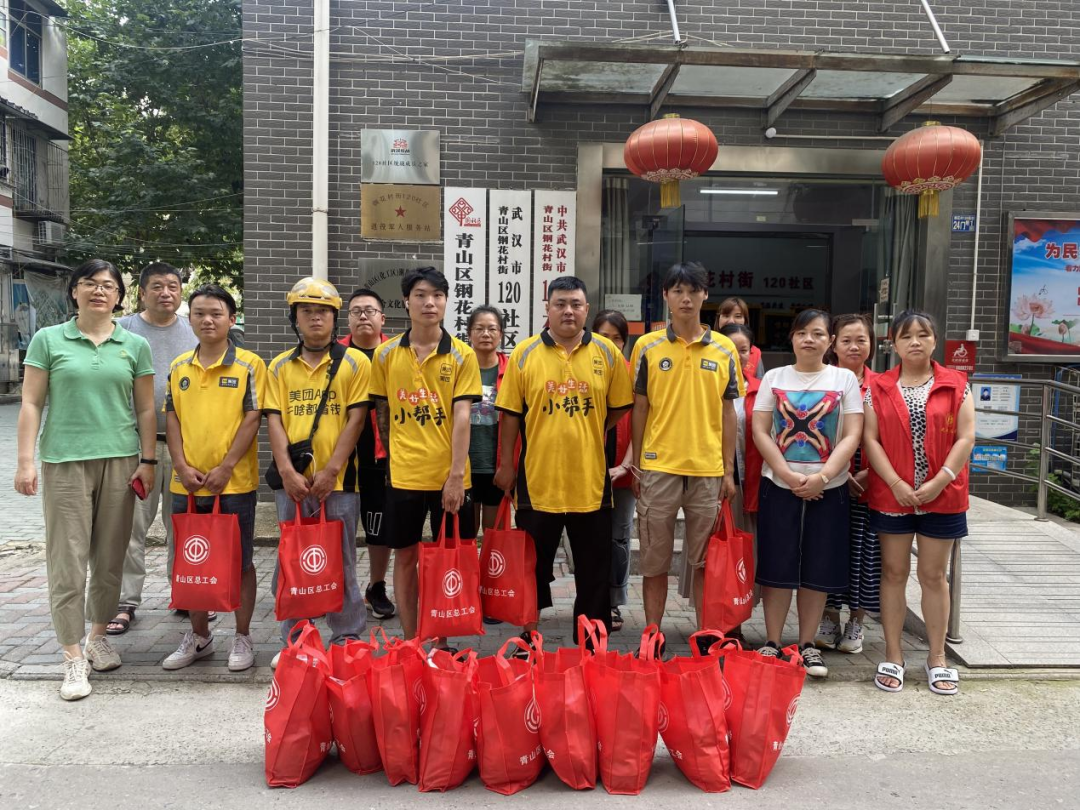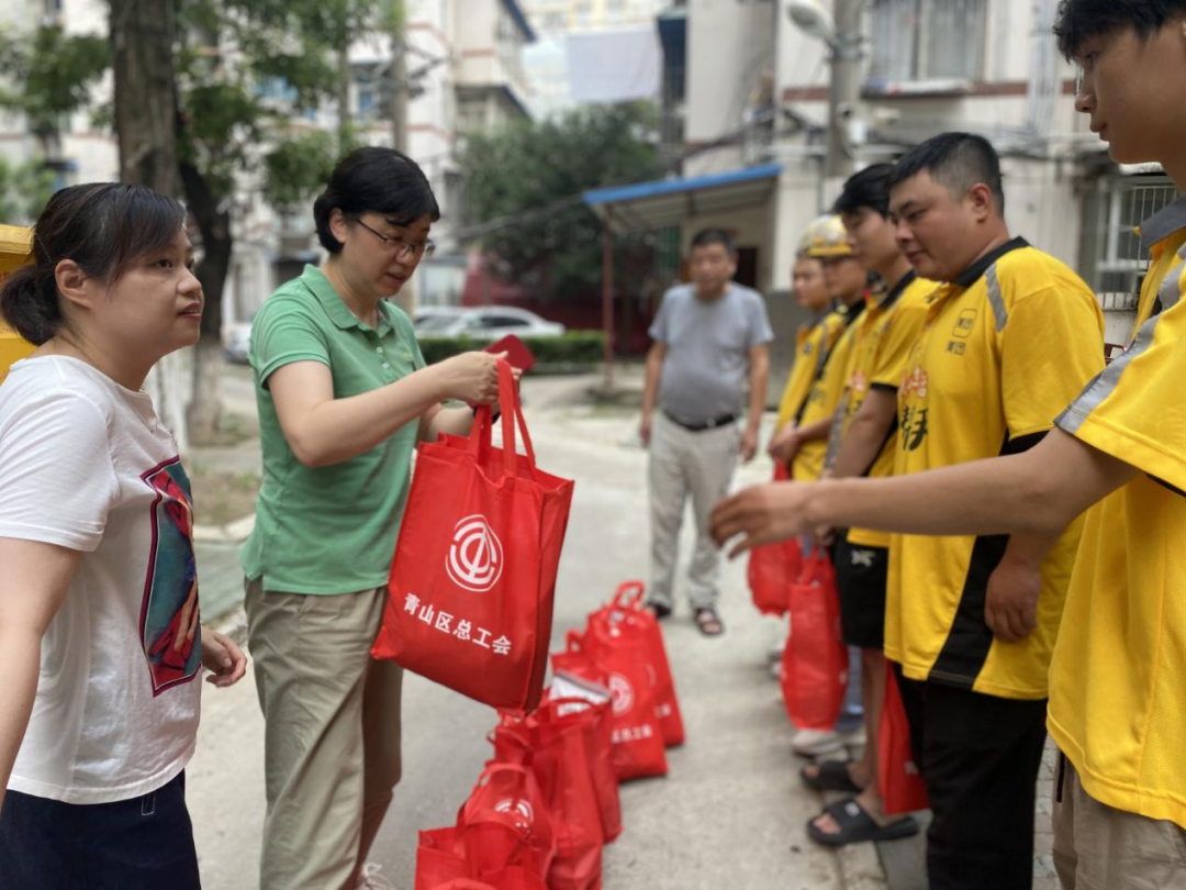 入夏以来,气温持续攀升,快递员、外卖小哥等新业态劳动者却依然头顶烈日,坚守岗位奋战在高温下。为做好高温天气下劳动者保护工作,钢花村街道120社区联合青山区总工会开展“送清凉”活动,慰问坚守一线的新业态劳动者。