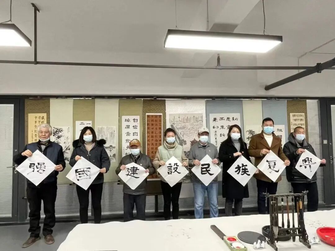 活动参展代表在现场挥毫泼墨,以“强国建设,民族复兴”八个字作为内容齐心协力创作主题书法作品。这八个字出自习近平总书记在十四届全国人大一次会议重要讲话,字字铿锵有力、掷地有声。