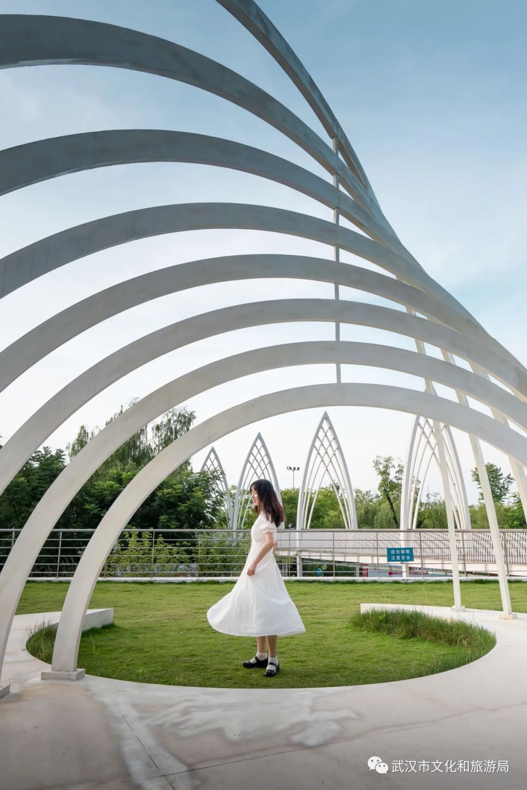 继续向东走,你会路过一处纯白拱门,那是青山江滩「婚礼堂」,这里入驻了武汉第一所江边婚姻登记处,附近还有能承办婚宴的草坪,可以大方进去逛逛。