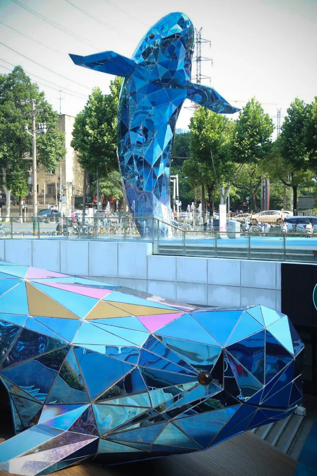 从花鸟鱼虫市场出来,沿着建设五路步行100米就到了「印象城」的名片——「江豚广场」。这两只憨态可掬的江豚,一只上演喷泉表演,另一只在下沉广场提供遮荫,是小朋友们的另类滑梯。