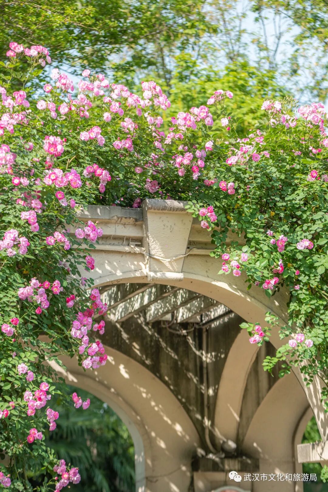 「月季园」是和平公园最出圈的打卡点。每年春天,月季、蔷薇开得最热烈,靓女们穿着复古衣裙来打卡。蔷薇沿着拱券连廊攀爬,很有欧洲复古电影的味道。