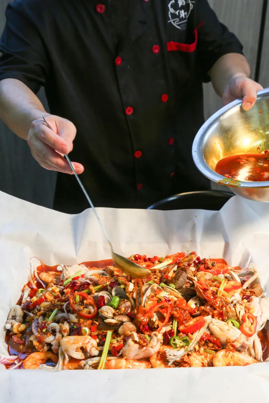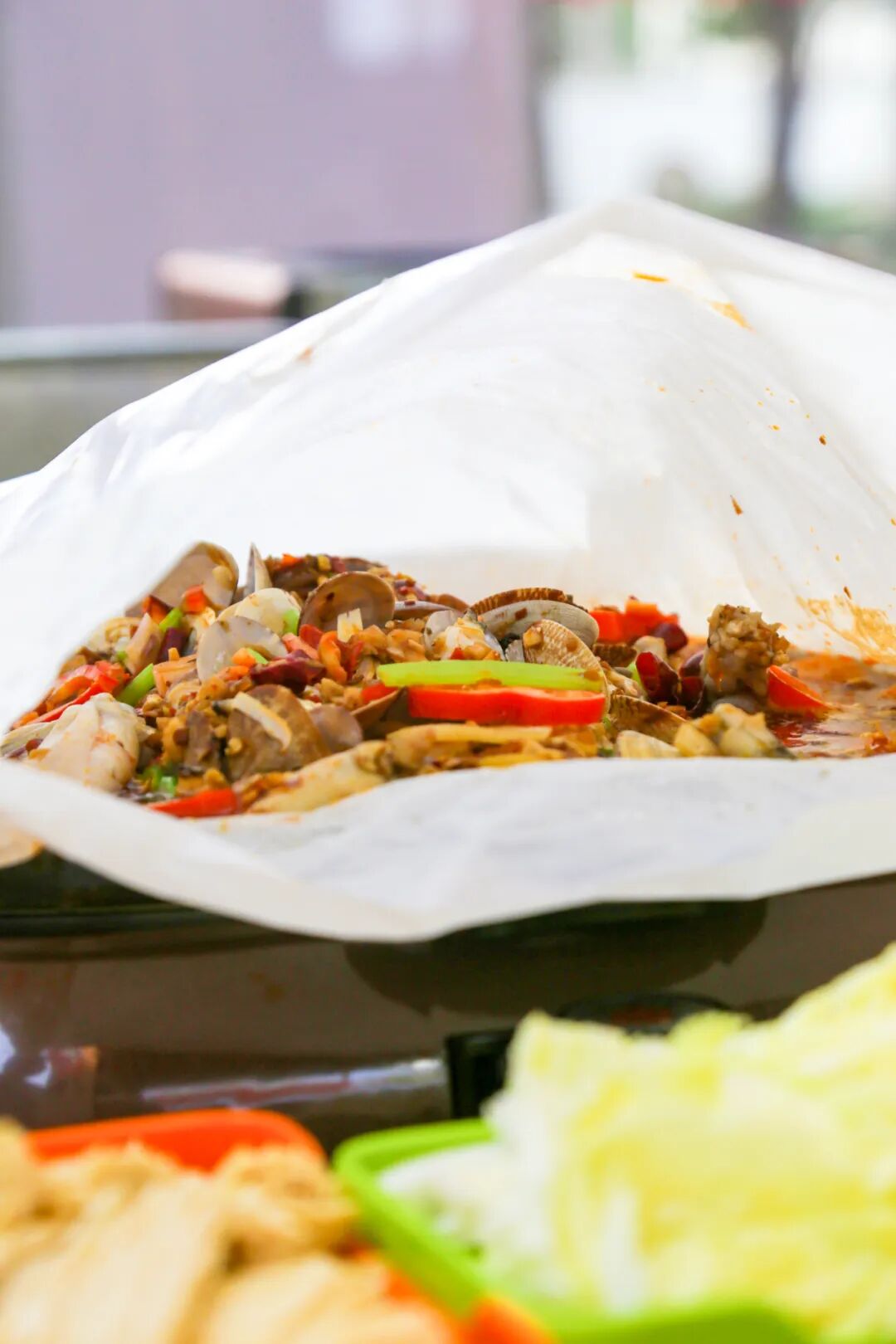 摒弃了传统的炭烤模式,纸包鱼在电炉高温加热下,佐料和鱼肉得到充分渗透。伴随着汤底“咕噜咕噜”的冒泡声,鼓满蒸汽的油纸最终被揭开,氤氲已久的香味连同着热气一涌而出,鲜红的汤汁搭配雪白的鱼肉,足以征服所有挑剔的吃货,视觉和嗅觉同时得到前所未有的享受。