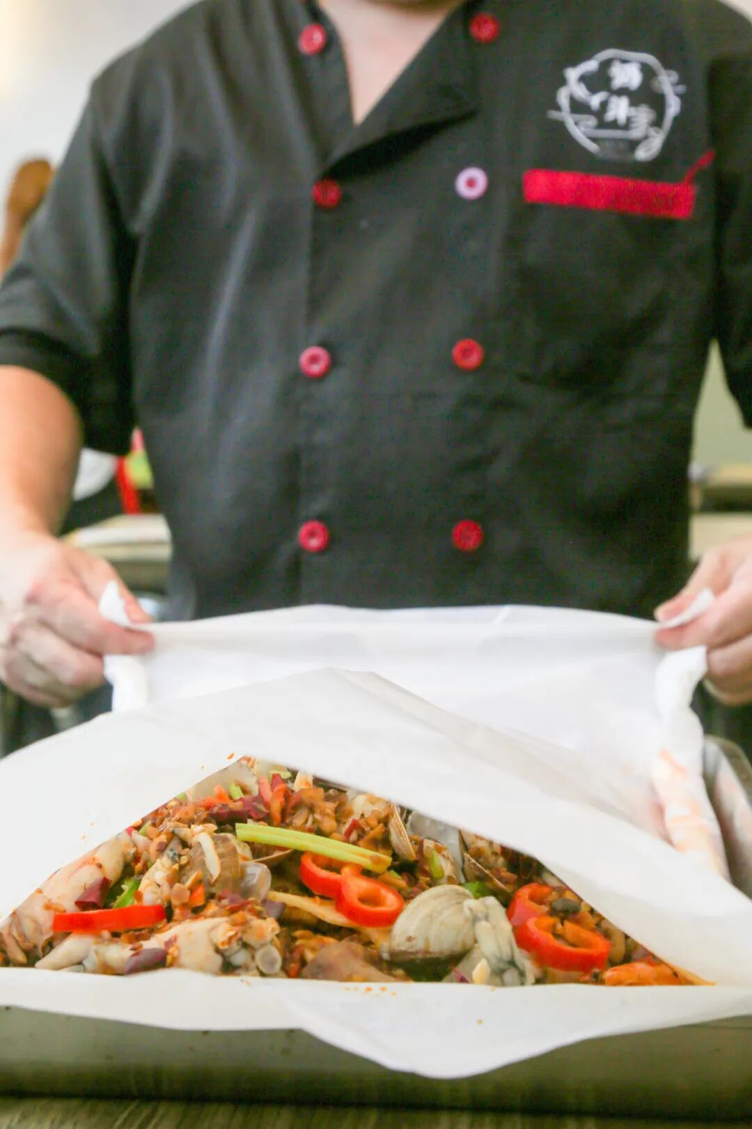 端上桌前还要经历一道重要的工序,需要用硅油纸将鱼进行全方位包裹,不仅充分保持住鱼肉的原汁原味,使其营养不形成流失,同时也为这一别样风味增添不少神秘感。