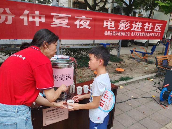 虽然天气炎热,但也阻挡不住大家观看露天电影的热情,不到七点,已有不少居民来到放映现场,等候电影开始。园林社区志愿者为前来观影的居民安排好座位,并送上消暑降温的冰镇酸梅汤。