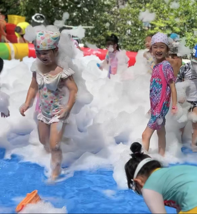 泡沫机在游泳池里发射白色的雪花泡沫,漫天飞舞的“雪花”从天而降,霎时间,游泳池便被轻柔的白色泡泡覆盖,活动现场一片欢乐的海洋。