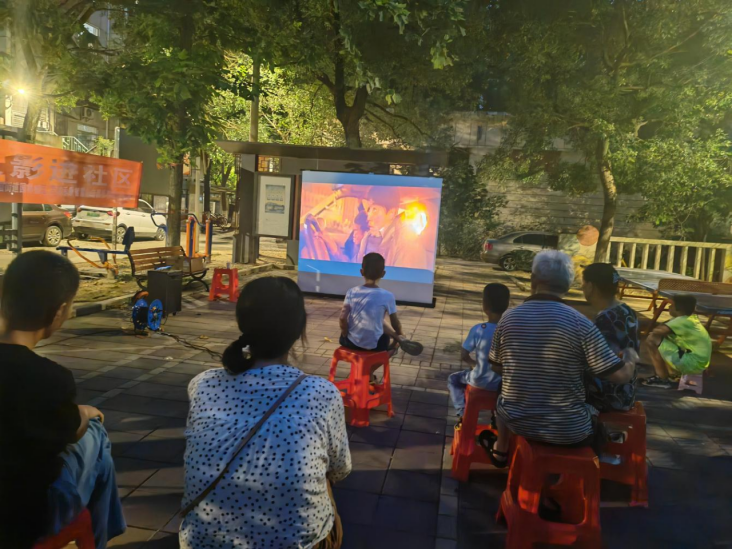 夜幕降临,电影开场啦!本次放映的是由真实事件改编的爱国主题电影《万里归途》,居民朋友们沉浸在电影剧情中,感受着主角的爱国热忱。