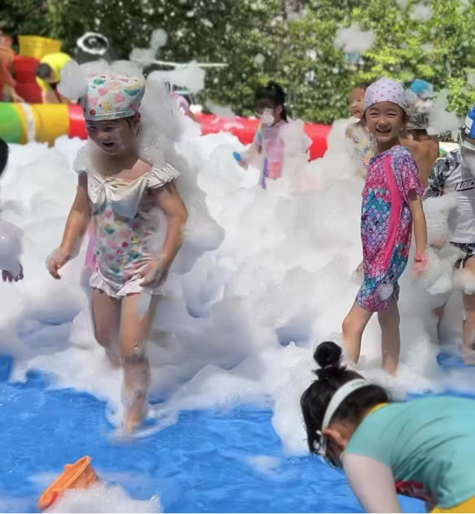 整装待发的孩子们纷纷投入泡泡的怀抱,在泡泡池中跟随着音乐节奏尽情舞动跳跃。热闹的游泳池里,飞溅的泡沫与水花,爽朗的笑声,像一个个美妙的音符,共谱出一场别开生面的音乐会。