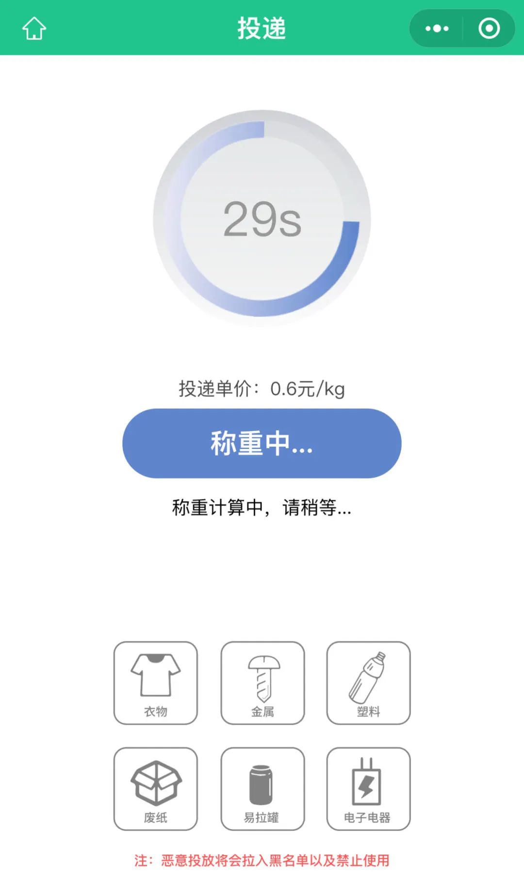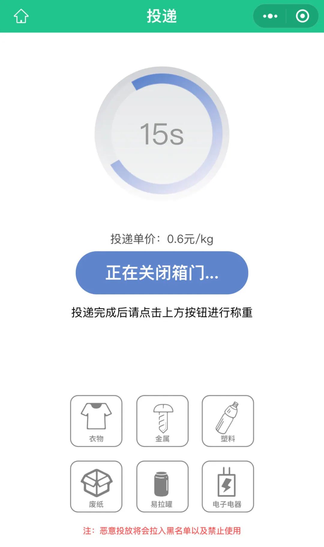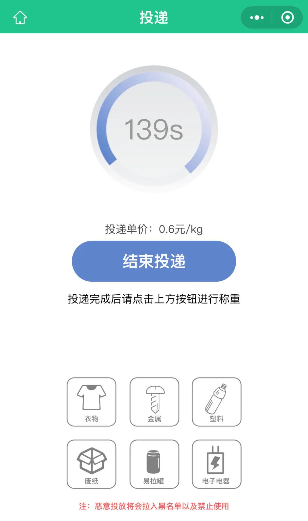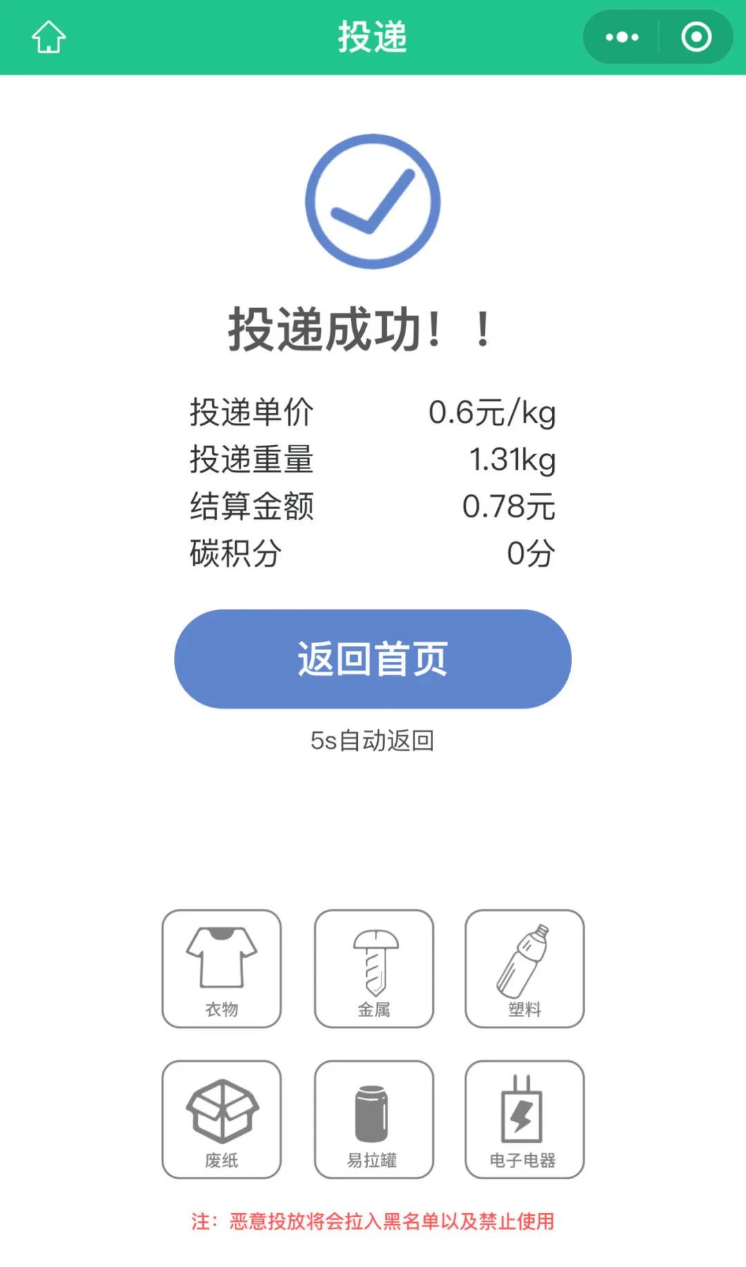 6. 投递成功,按照0.6元/kg的标准获得相应结算金额或碳积分。