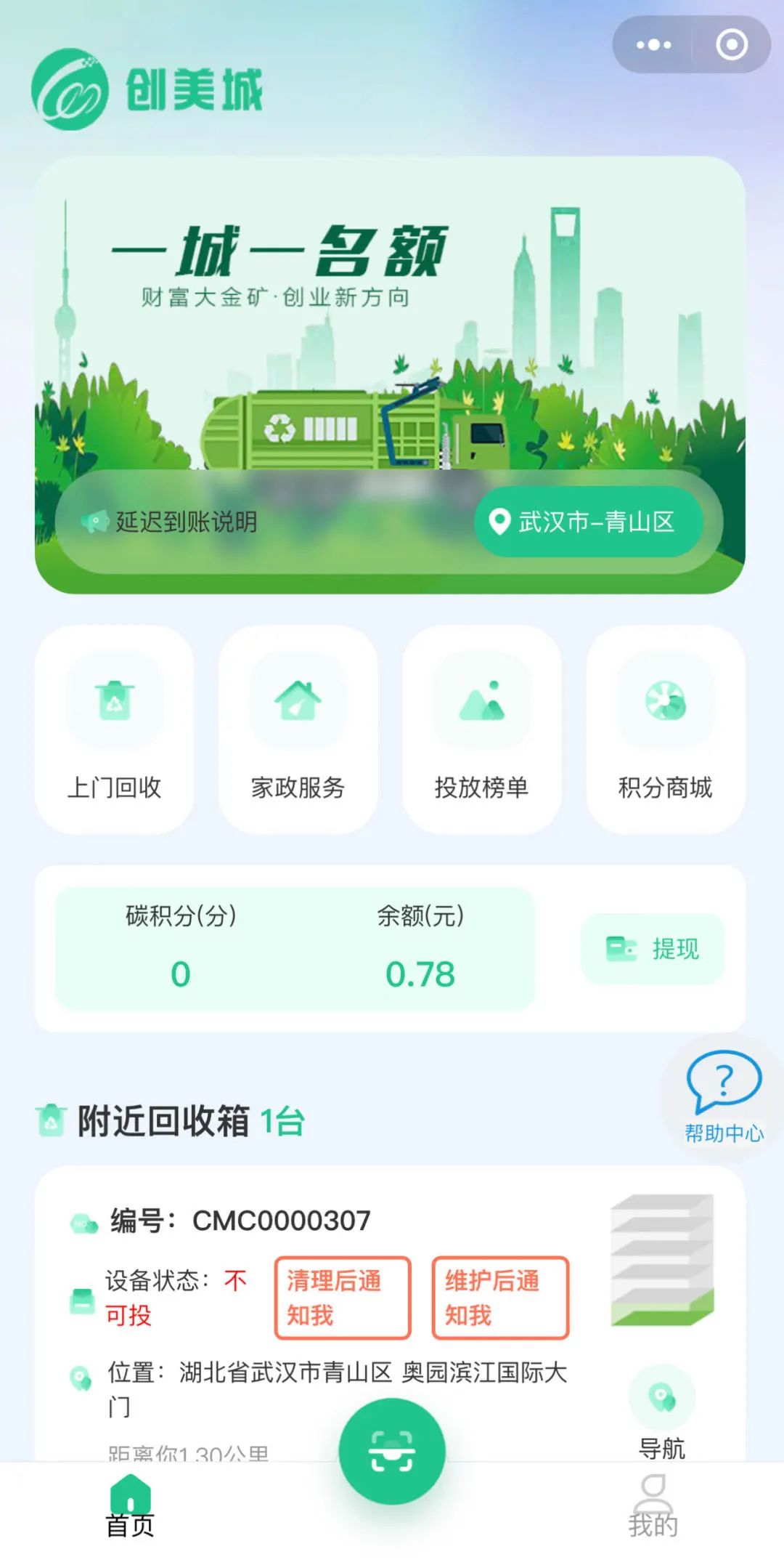 1. 小程序首页可查看碳积分和余额。