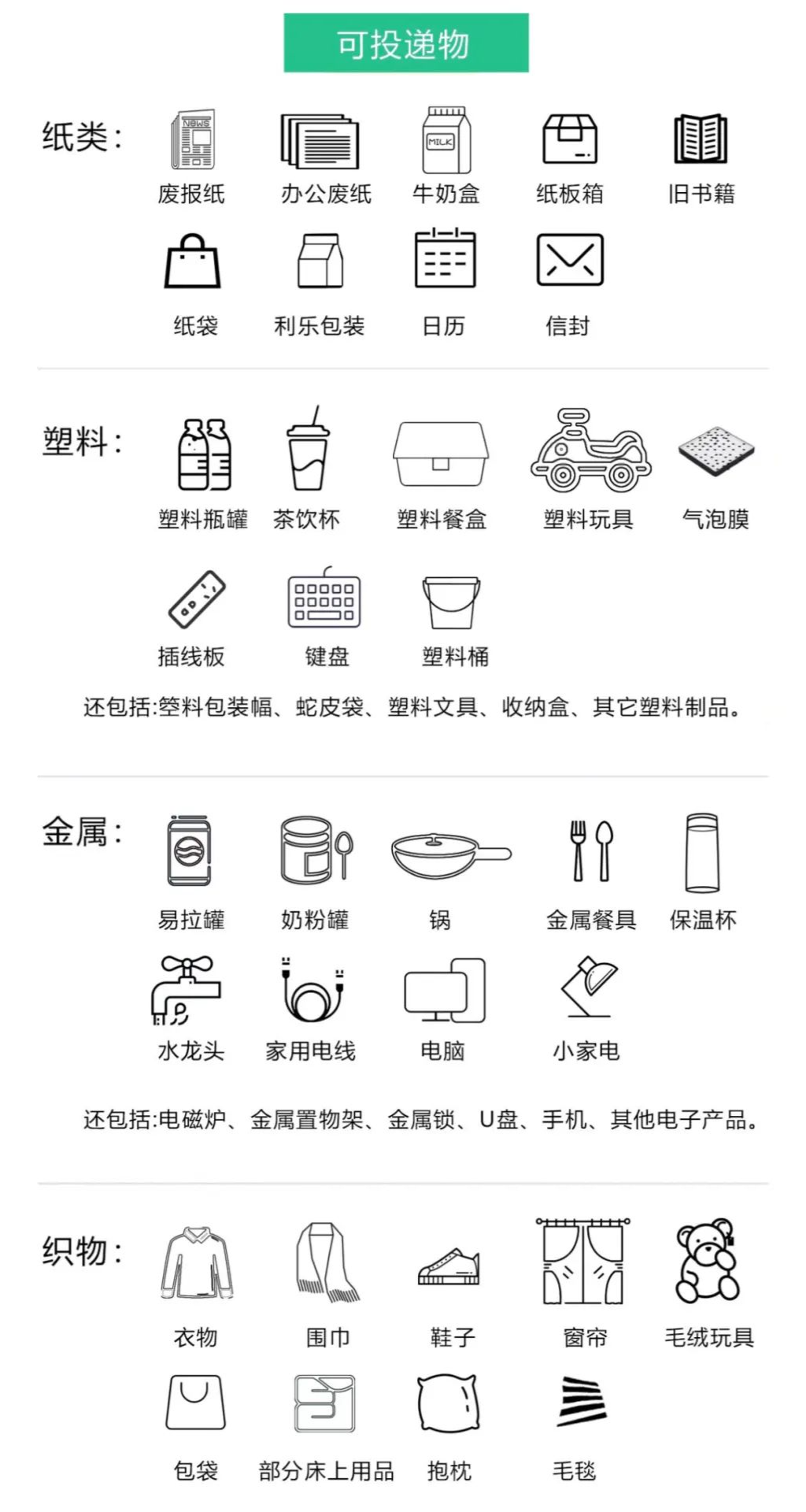 1. 纸类:快递箱、包装盒……2. 金属:易拉罐、奶粉罐……3. 塑料:塑料瓶罐、茶饮杯……4. 织物:衣物、围巾……