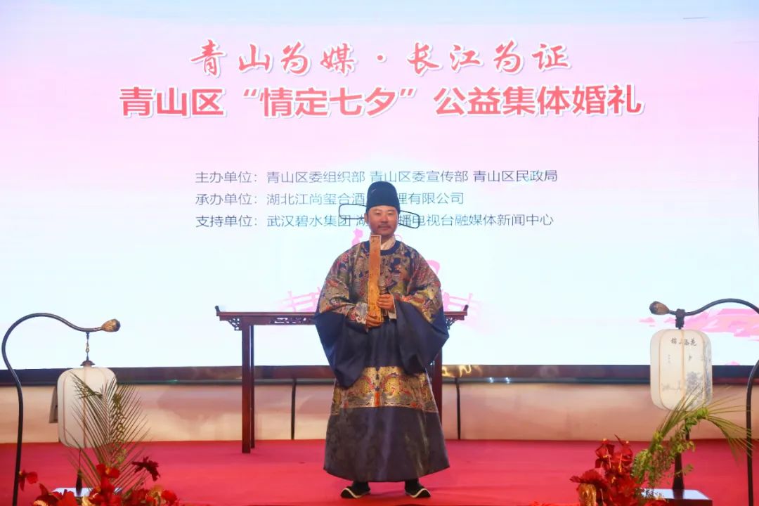 本次活动由青山区委组织部、区委宣传部、区民政局共同举办,湖北江尚玺合酒店管理有限公司承办,通过集体婚礼的形式,展示江城武汉青年健康向上的文明风采,倡导移风易俗,推进婚俗改革,弘扬社会文明新风。