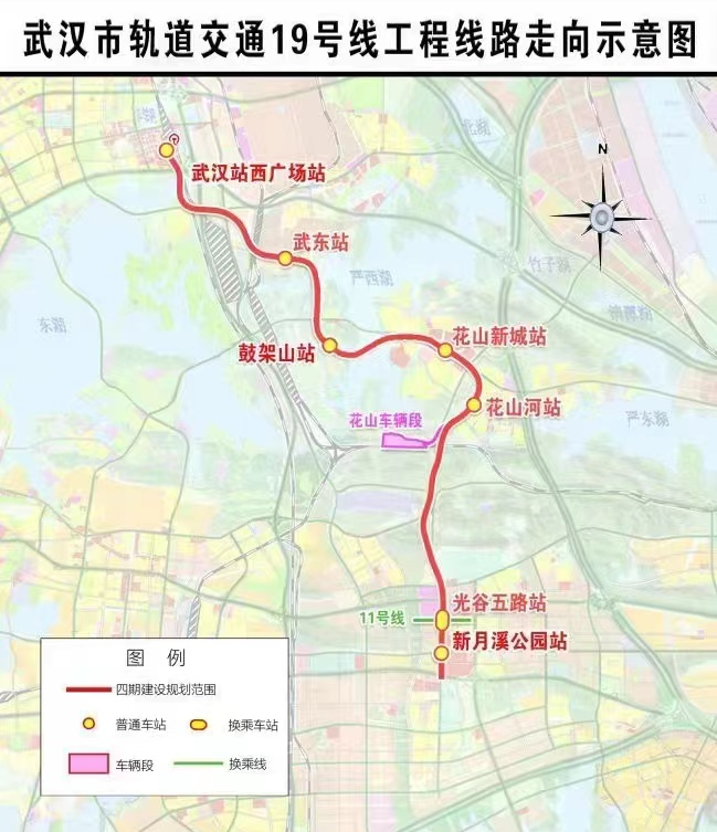 武汉地铁19号线起于武汉站西广场站,线路沿武东路、花城大道、花山大道、光谷五路走行,止于新月溪公园站,全长约23.3公里,设车站7座,全为地下站。19号线建成后,将更好地服务杨春湖城市副中心、武东片区、鼓架山地区、花山新城、东湖高新光谷中心城轴线,强化与武汉火车站、天河枢纽、武黄城际铁路等对外交通枢纽衔接,支撑武东、鼓架山、花山、东湖高新区发展。