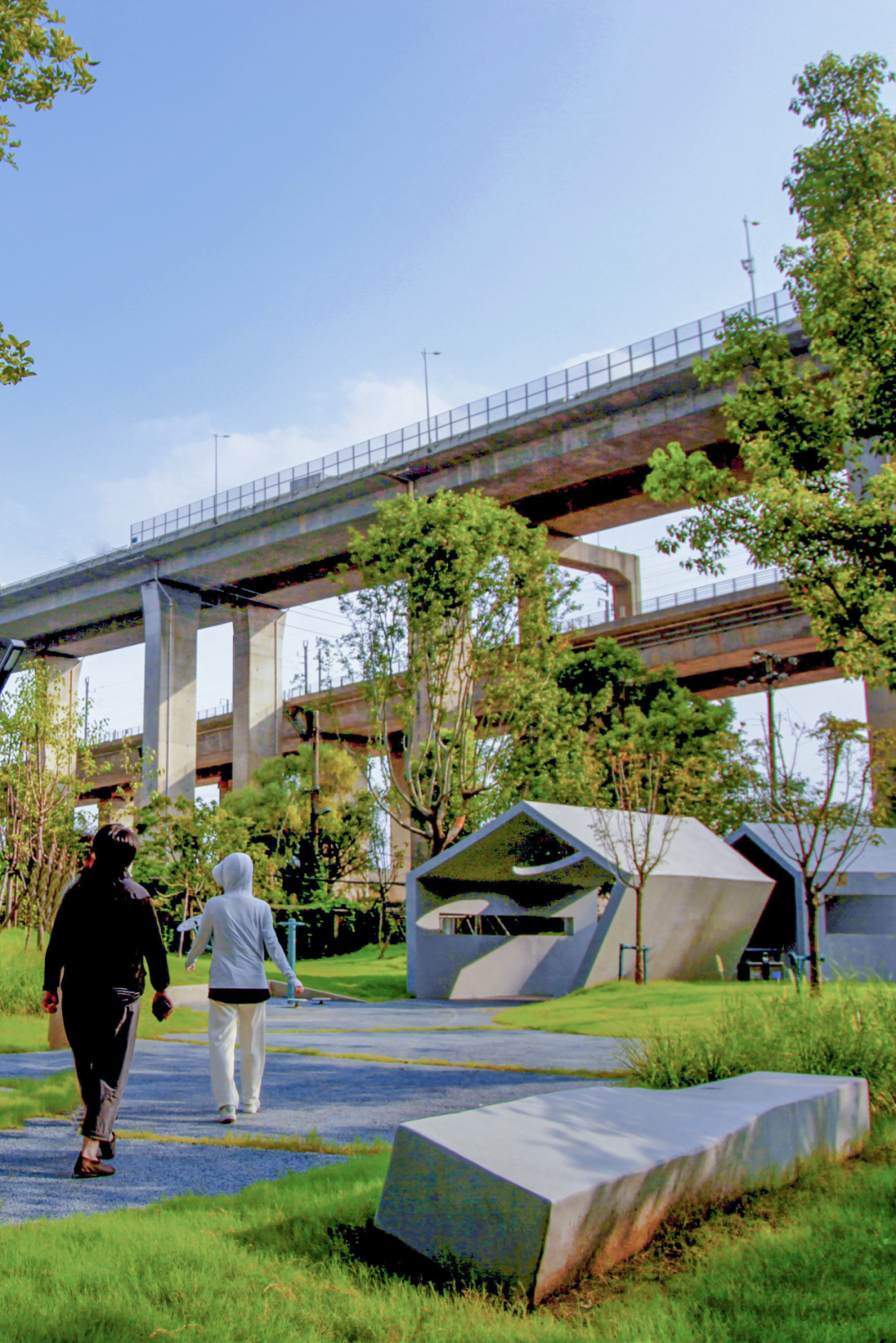 “森呼吸”口袋公园位于天兴洲大桥引桥东侧正下方,周边有临江港湾和七星富利两个小区,原址有两处旧厂房和一个违建的小型集贸市场,面积约为3300平方米。
