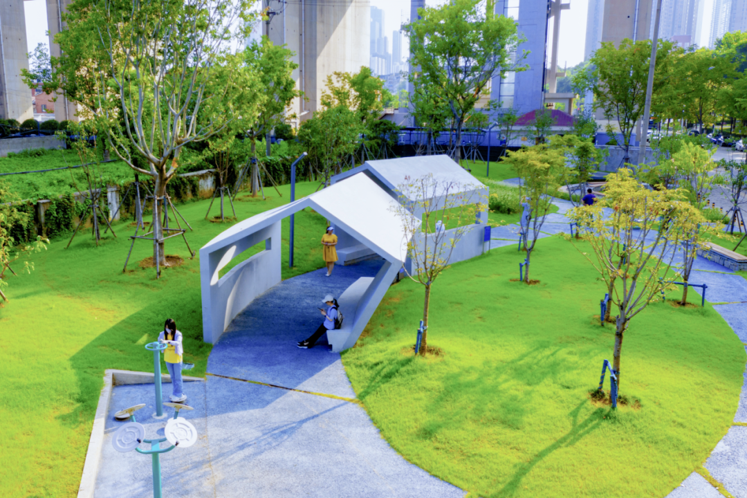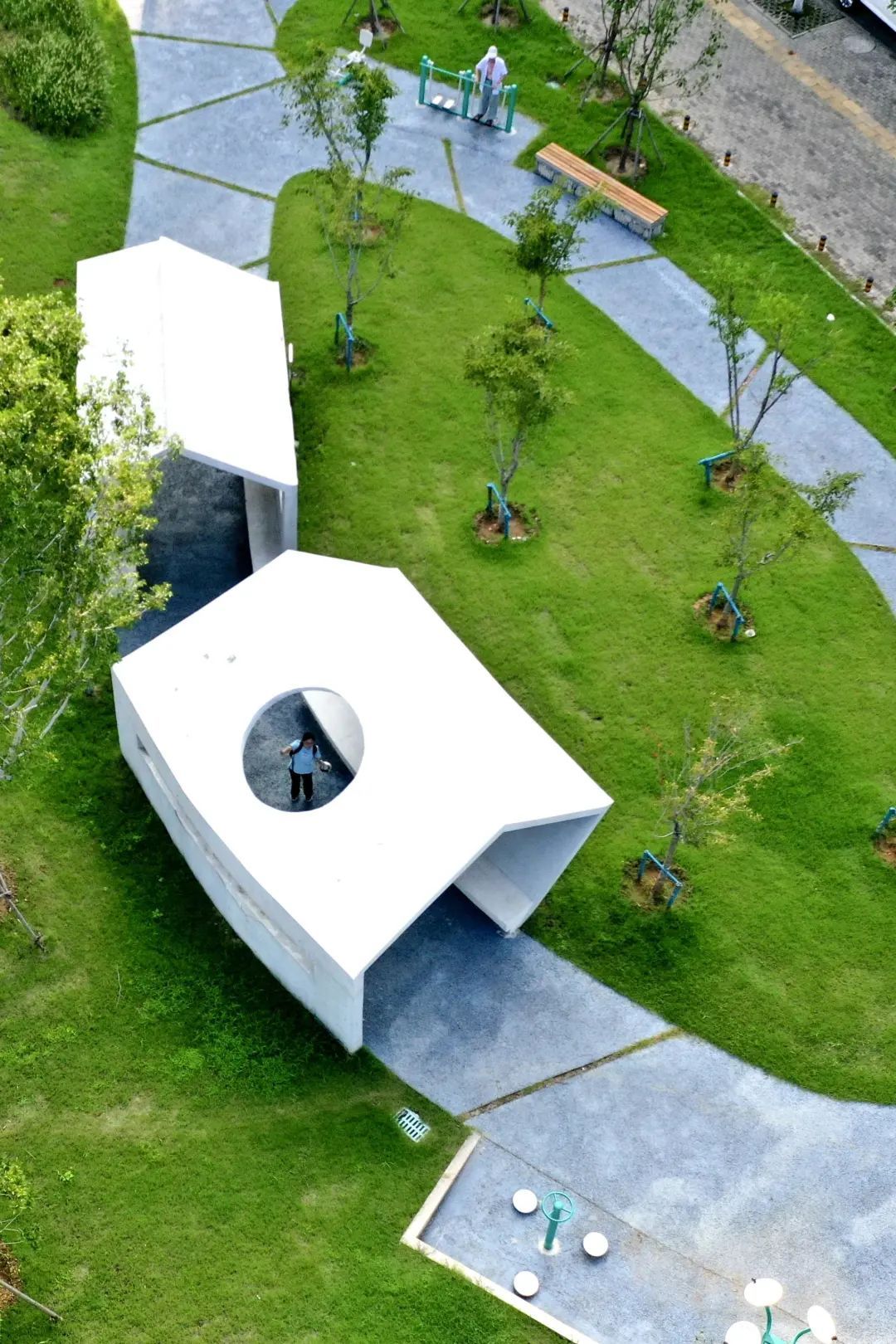 “森呼吸”口袋公园分为景观休闲区和生态停车场两大功能区。公园建设充分践行生态环保理念,凿除的水泥块作为景观材料使用,可以铺装裂缝花园、填充石篓、充当地下碎石层疏导雨水等。景观廊架设计沉成为小屋形状,使用透光混凝土材料,营造出温馨的休憩、交流空间。