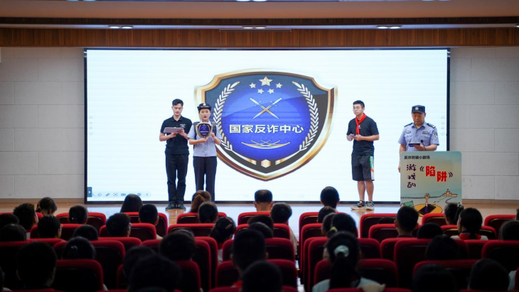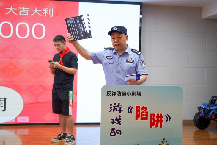 当“小陈”同学即将落入“骗子”设计的圈套时,“英模背包服务队”骨干同志张瑶及时出现,先后从背包里拿出“反诈防骗”三件法宝——国家反诈中心APP盾牌、96110大锤、玫瑰金手铐,将“骗子”绳之以法。“全国优秀人民警察”胡永鹏现场讲解反诈知识,提醒同学们在玩电子游戏时务必提高警惕,不要掉入骗子的陷阱。