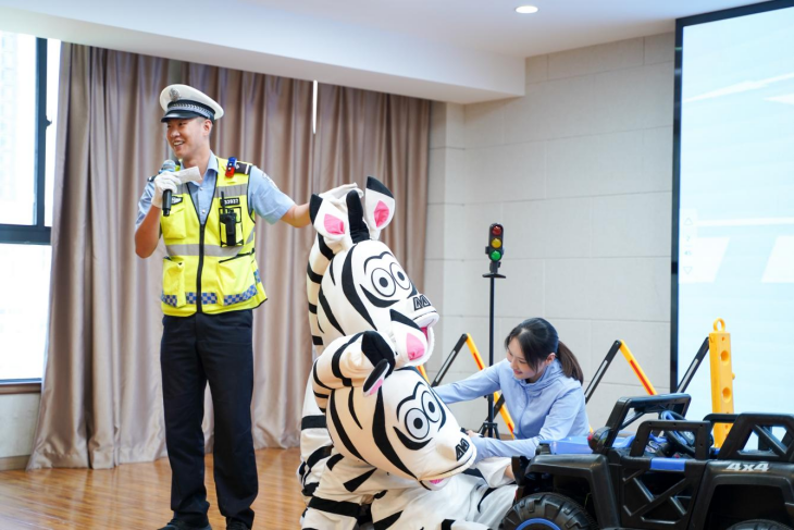 “不得了,小斑同学闯红灯被车辆撞倒了。大家一定要按照交通信号灯来过马路,只有人人都遵守交通安全法规,我们的出行才有安全保障。”青山区交通大队民警刘敏、郭昊和同事们一同带来交通安全情景剧。他们将超大号的儿童电动玩具车开上了舞台,通过憨态可掬的表演、风趣幽默的语言,配以趣味十足的动画背景,虚拟与现实的结合,让孩子们身临其境地感受违反交通安全存在的各类潜在危险,在欢笑中受到安全教育。“警小斑太可爱啦,我以后会遵守交通规则,平安出行。”现场的同学们说出了自己的想法。