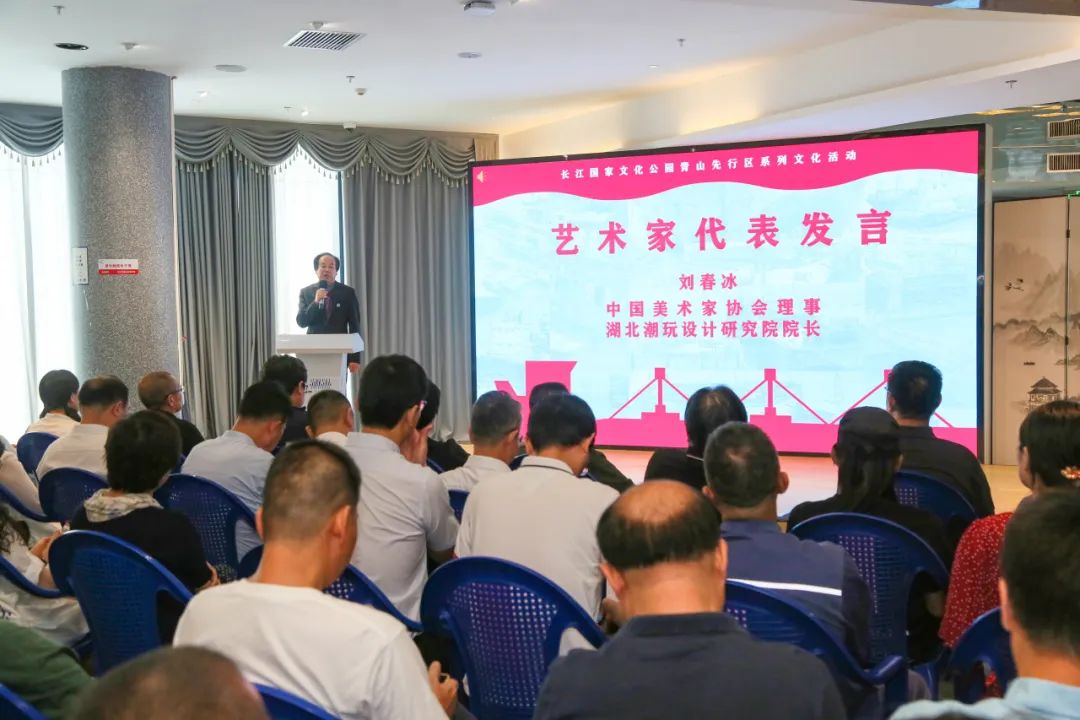 开幕仪式上还举行了青山区政府与湖北潮玩设计研究院落户青山的签约仪式,进一步推动青山区文化产业高质量发展。随后,四位企业家代表为长江国家文化公园青山先行区系列文化活动捐赠了启动资金。艺术家代表刘春冰、沈祥胜、徐武斌、刘群上台为支持系列文化活动的企业家赠送画作。青山区文旅局还专门带来了一冶版画研究院傅树清老师的兔年生肖版画作品,赠送给四位艺术家,祝福他们身体健康、兔年吉祥,也希望各位艺术家能继续关心和支持青山文化事业的发展。