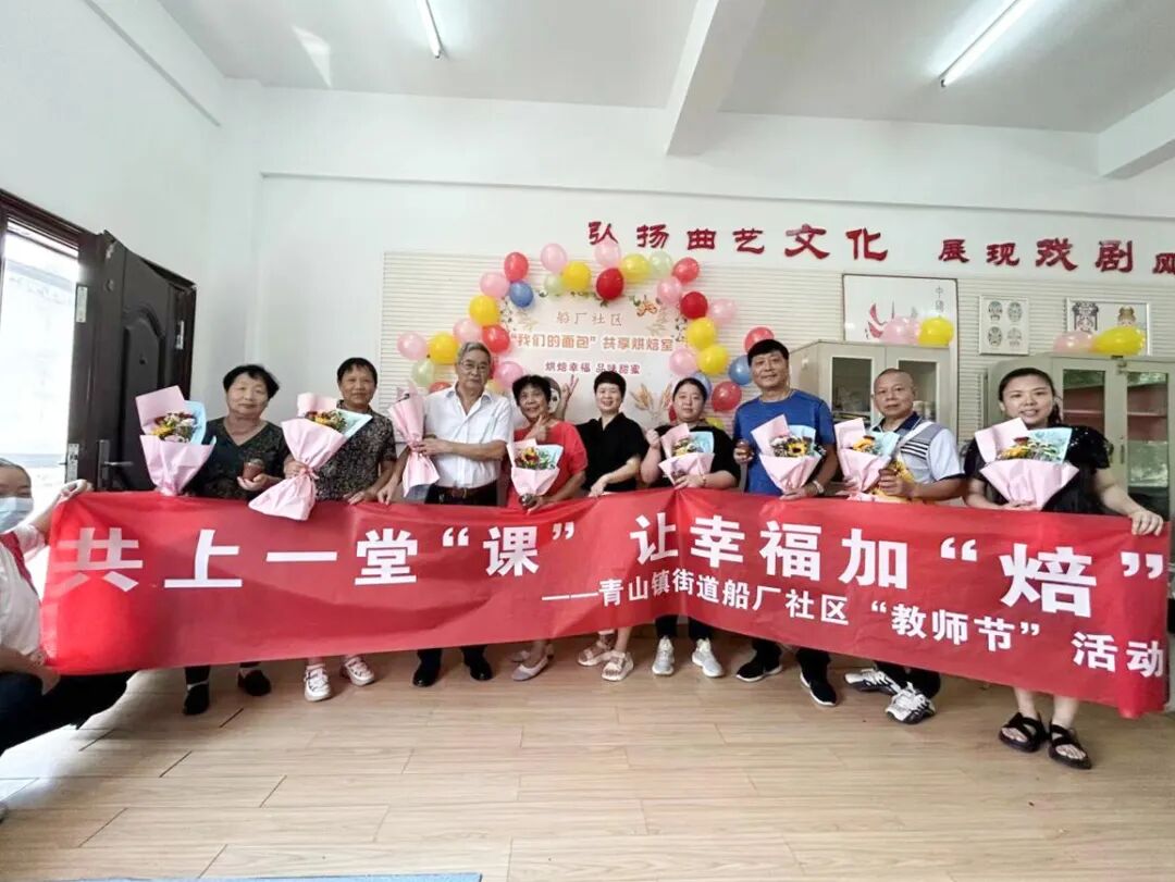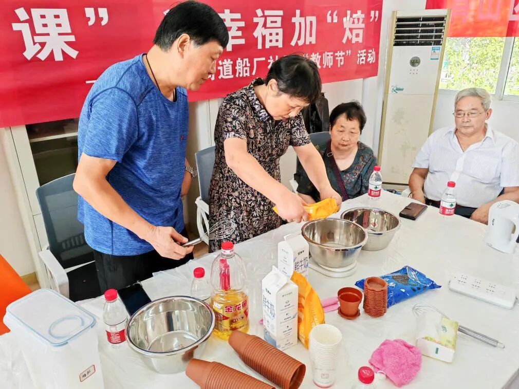 为迎接第39个教师节,青山镇街道船厂社区开展了“共上一堂‘课’,让幸福加‘焙’”教师节烘焙活动,邀请来自青山小学老师、辖区退休老师、社区课堂志愿者老师和社区“四点半学校”青年老师们共聚一堂,同庆节日。