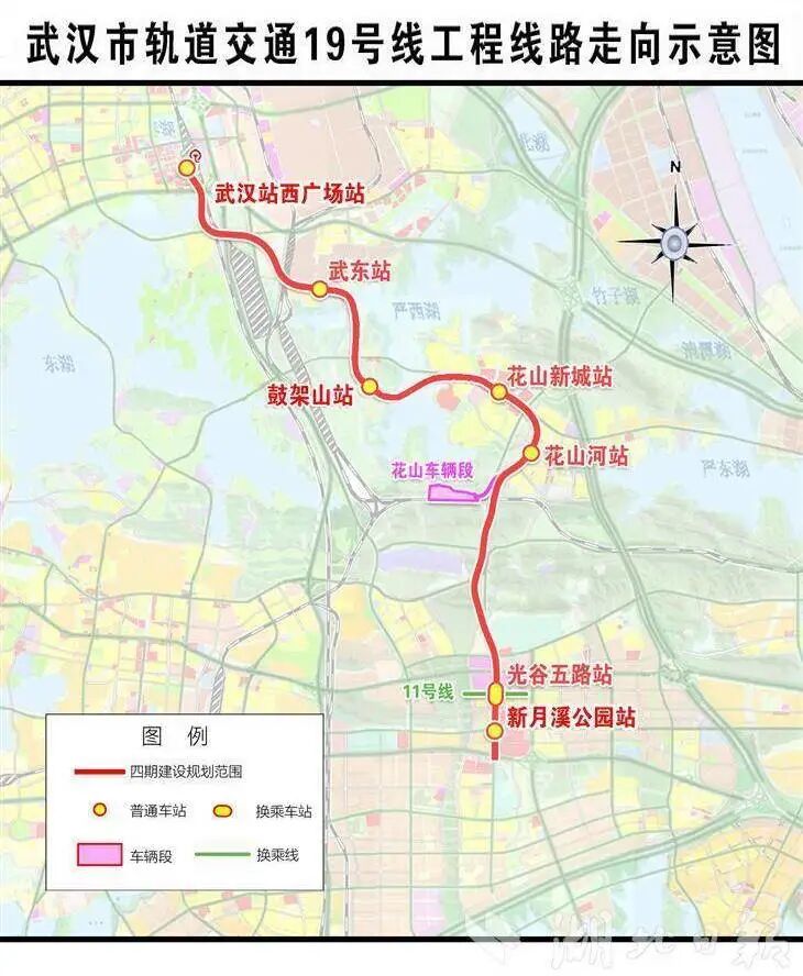 19号线全长约23.3公里,共设车站7座,全为地下站,分别为武汉站西广场站、武东站、鼓架山站、花山新城站、花山河站、光谷五路站和新月溪公园站,途经洪山区、青山区、东湖风景区、东湖高新区4个区。