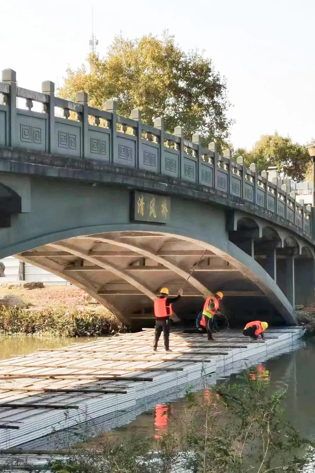 △在原清风桥下搭建浮桥