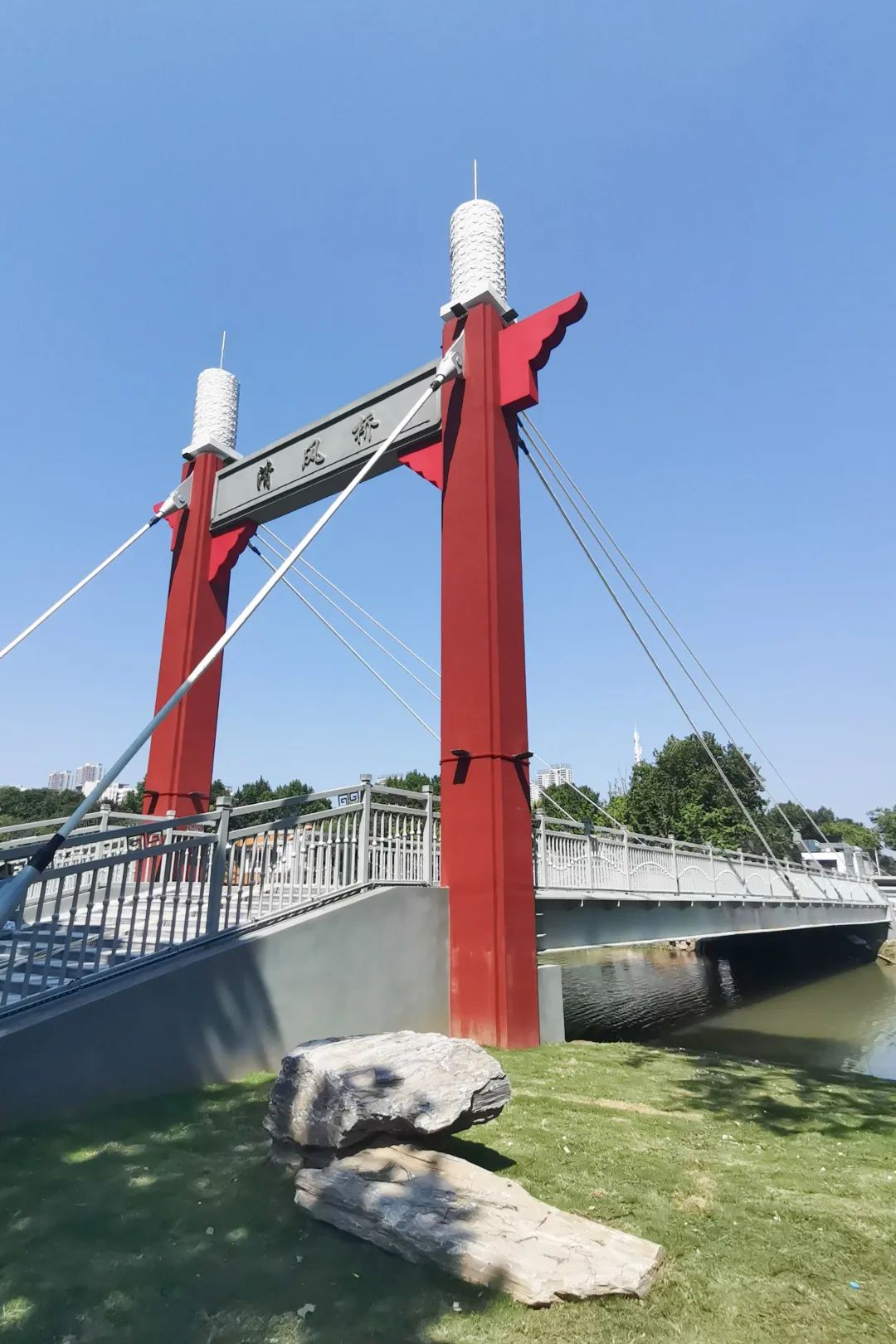 水丰草茂的楠姆河上,清风桥格外醒目。白色的桥体清爽利落,高高矗立的深红色索塔、深灰色横梁,搭配白色祥云纹花岗岩和金色的“清风桥”几个大字,让清风桥兼具了现代美与古典美的完美融合,呈现出别样风采。