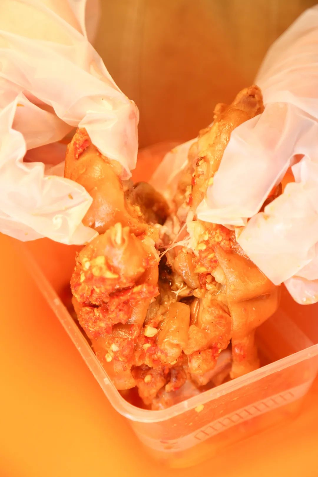 淋上适合武汉人口味的秘制蒜蓉辣酱,等不及将猪蹄攥在手中,塞进嘴里,浓香在舌尖迸发,软糯弹牙的表皮,劲道厚实的肉感,轻松脱骨的舒爽,让人不禁想停留在这一刻的美好。