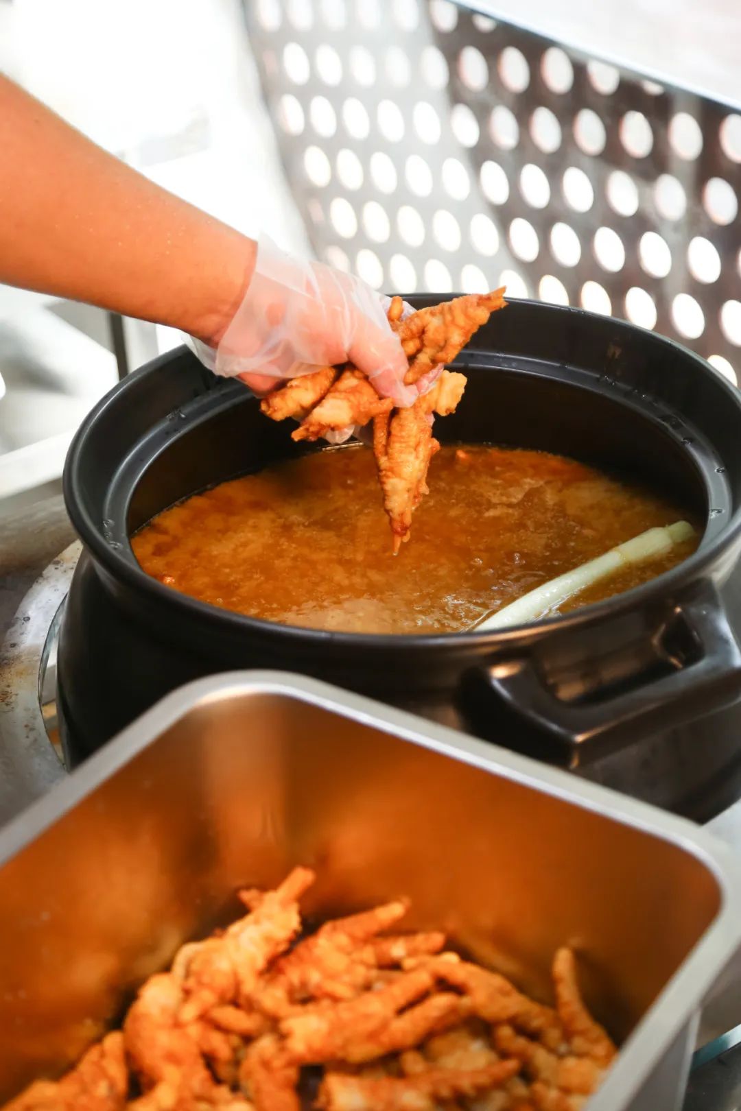 “我们每天早上六点,趁着猪蹄和鸡爪还处于最新鲜的状态,便要开始处理这些食材。冷水浸泡、喷枪烤皮、修剪蹄甲、焯水去腥,保证每一根猪蹄和鸡爪都被处理到位,这样才能在最终出品时给到顾客满意的口感。”赵老板一边说着话,一边一刻不闲地忙着手上的活,准备起各种卤料。