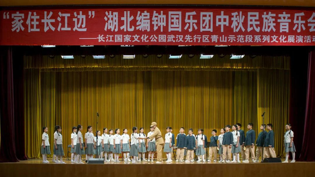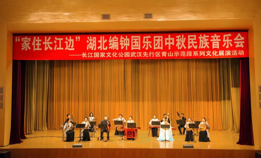 听经典民乐,过传统佳节。9月28日晚,青山区机关综合楼一号会议厅琴声悠扬、鼓声阵阵。由区文化和旅游局主办的长江国家文化公园系列文化展演活动之“家住长江边”湖北编钟国乐团中秋民族音乐会,在这里精彩上演。