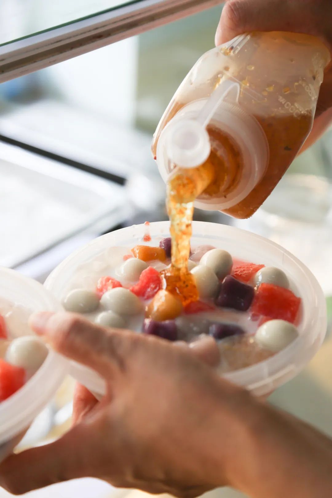 作为辅料的红糖水和椰子汁也同样由李姐亲自熬制而成,恰到好处的甜度让人无需担心长胖的问题,清凉的口感与冰粉和冰沙相得益彰。