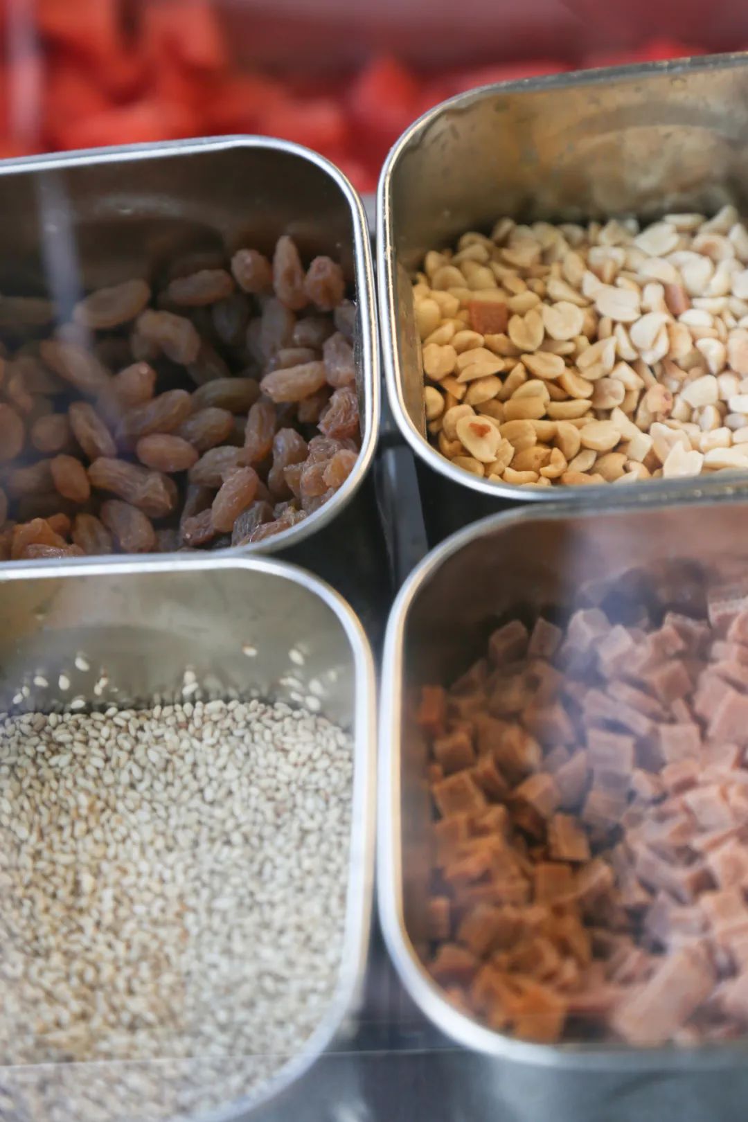 而配料的丰富永远也只有你想不到,没有丫丫加不了的,红豆、山楂片、葡萄干、花生碎、小芝麻以及应季水果的选择,让人直呼全都要。
