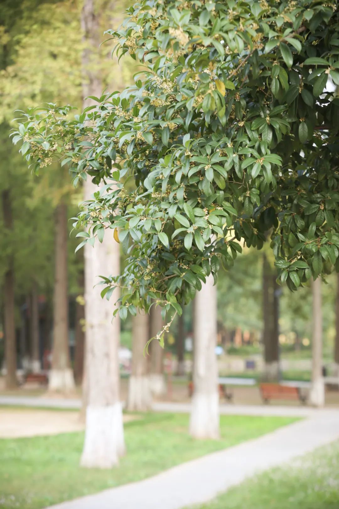 在绿茵广场旁,沿楠姆河的一侧还有数十株桂花树沿着绿道一直排开,齐整整迎着秋风,依旧热烈绽放中。
