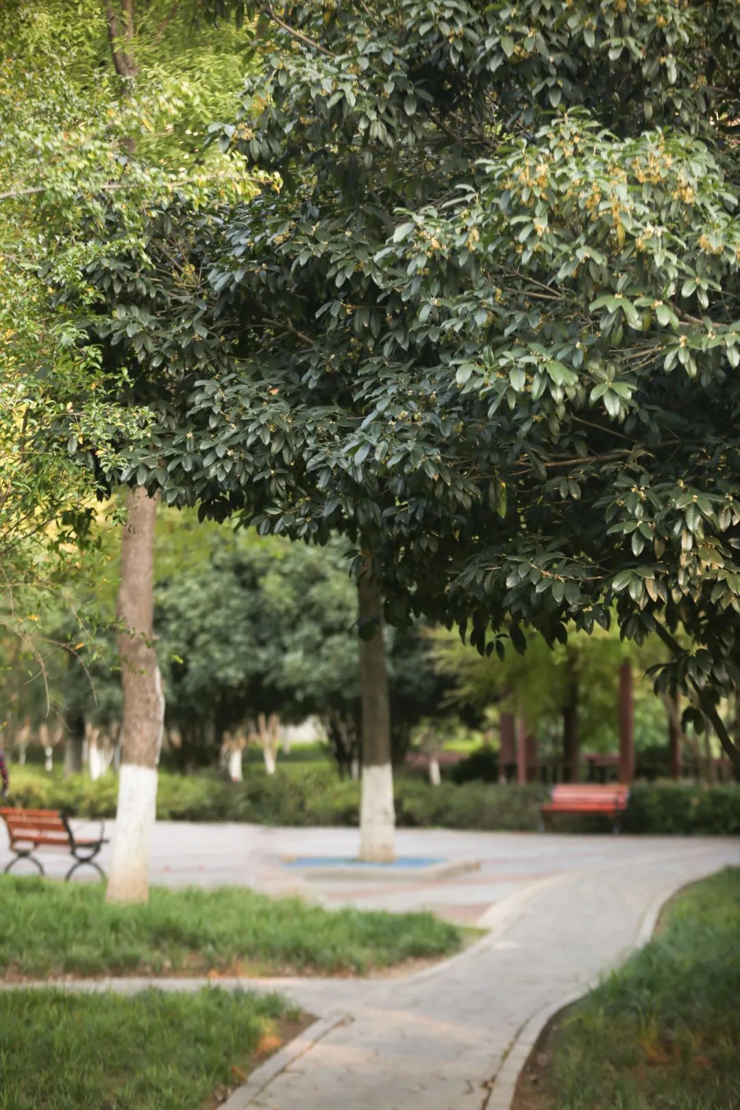 直立于草地上的株株桂花树树冠巨大,犹如一个个“显眼包”,想要错过都不行。满树金黄的桂花树,虽然花瓣小小,但在绿叶之间依旧惹眼,当游人在此驻足,让人挪不动脚步的便是那袭人的花香。
