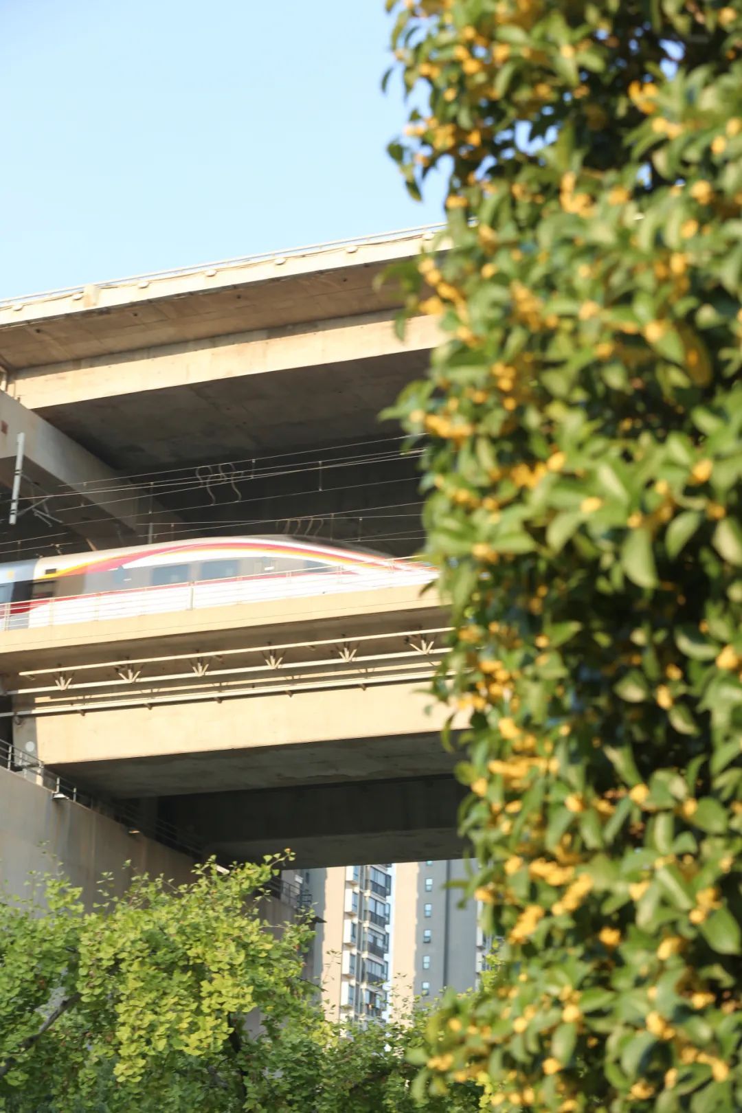 要说最绝的,当属时不时飞驰而过的高速列车,微微卷起一阵秋风,桂花浓厚的香气伴着花朵慢慢洒落,美得让人措手不及,让好心情“起飞”......