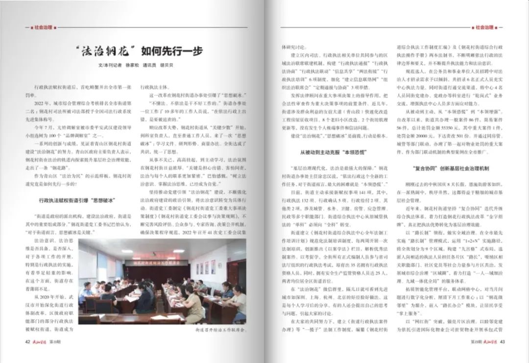 近日,《武汉宣传》在2023年第19期刊物中刊发了题为《“法治钢花”如何先行一步》的报道,通过4个版面的内容全面揭秘了“法治钢花”为何先行一步的方法。