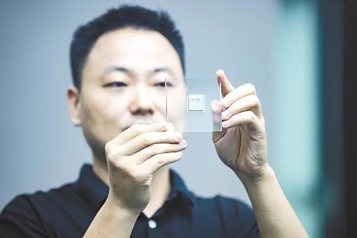 10月19日,在位于武汉市青山区的黑芝麻智能科技有限公司里,工作人员展示该公司自主设计研发的华山二号A1000自动驾驶计算芯片。(湖北日报全媒记者 何宇欣 摄)