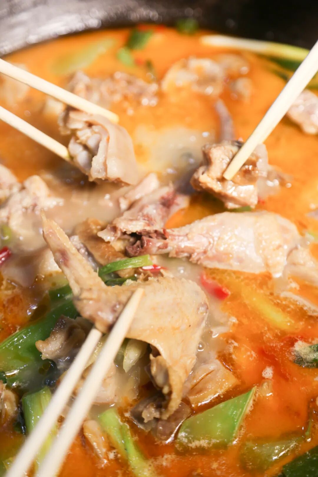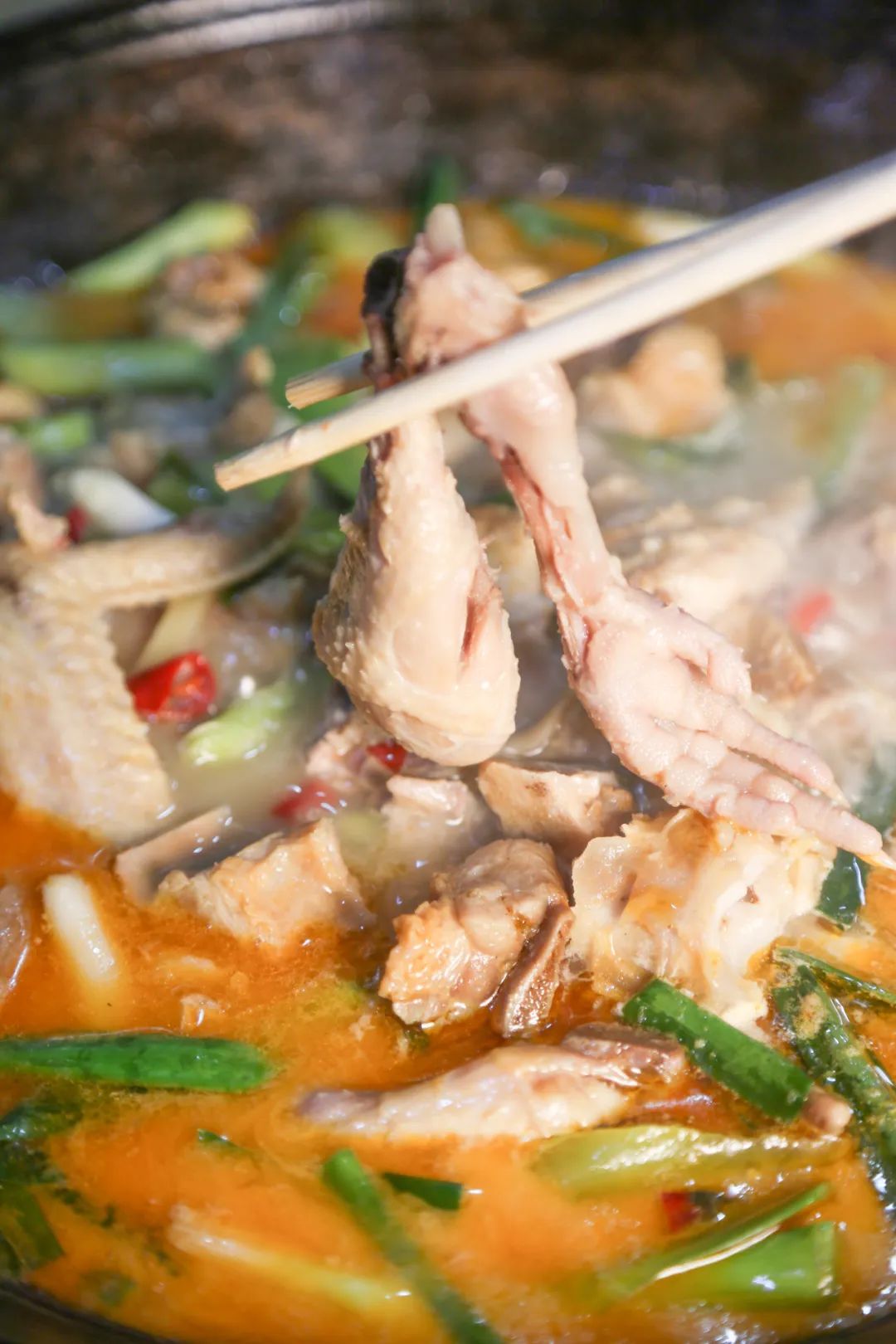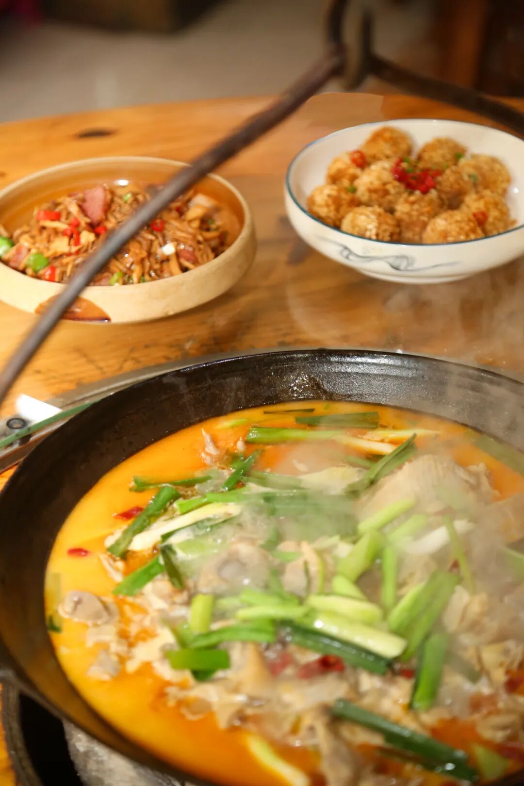 一锅吊锅在炭火的炙烤下显得通红,浓郁的汤汁“咕噜噜”地冒着气泡,丰富食材在浓汤的包裹中看得直叫人垂涎欲滴,再也走不动道。